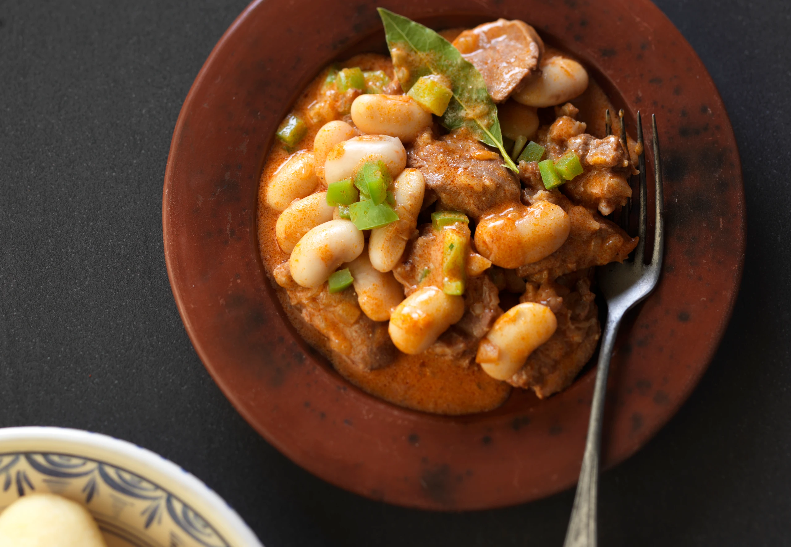 Fleisch in ca. 3 cm große Stücke schneiden. Bohnen in ein Sieb leeren, kalt spülen und abtropfen lassen. Paprika putzen und in ca. 1 cm große Stücke schneiden. Zwiebeln und Knoblauch schälen und fein schneiden. Speck klein schneiden.