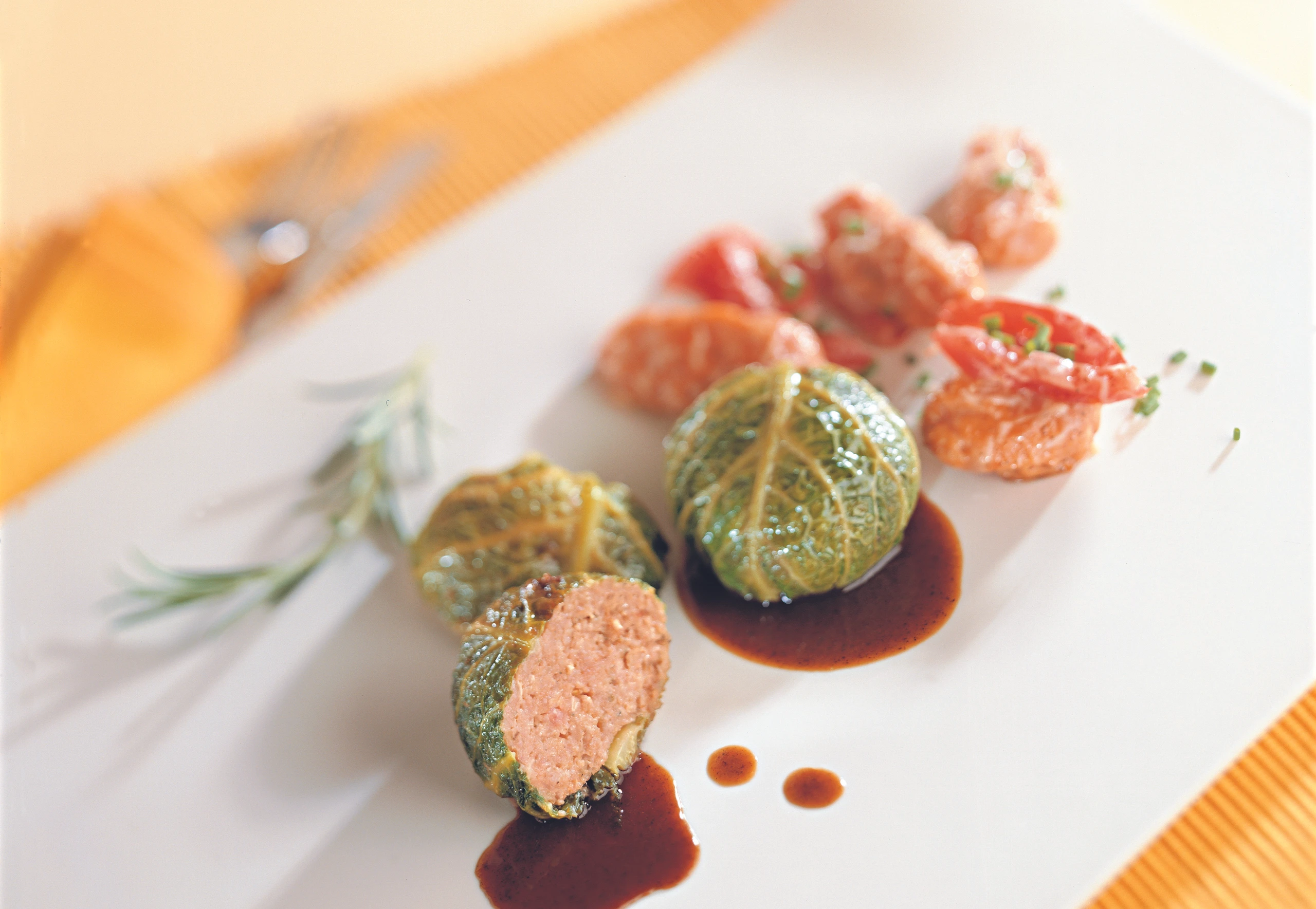 Aus dem Faschierten acht gleich große Kugeln formen, auf die Kohlblätter legen und darin einschlagen.