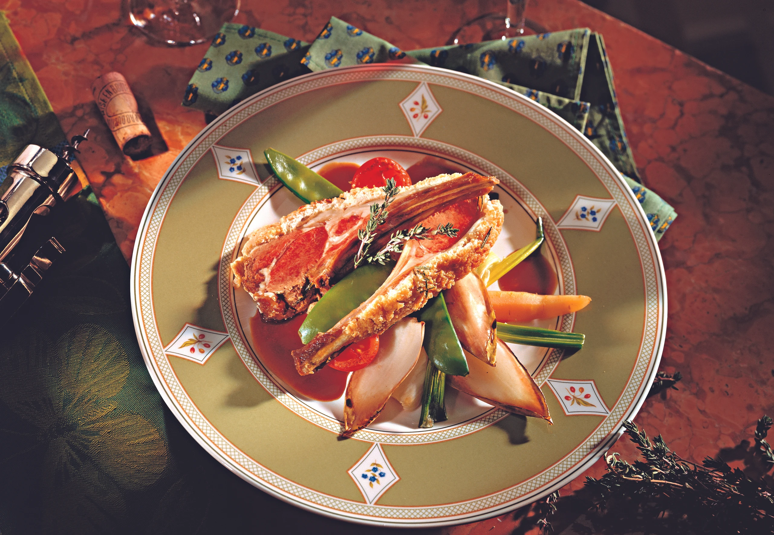 Lammkarree aus dem Rohr nehmen, in Scheiben schneiden und mit der Sauce und der Gemüsebeilage anrichten; eventuell mit Thymianzweigen garnieren. Als zusätzliche Beilage passen Zwiebelerdäpfel, gratinierte Erdäpfel oder auch Braterdäpfel.