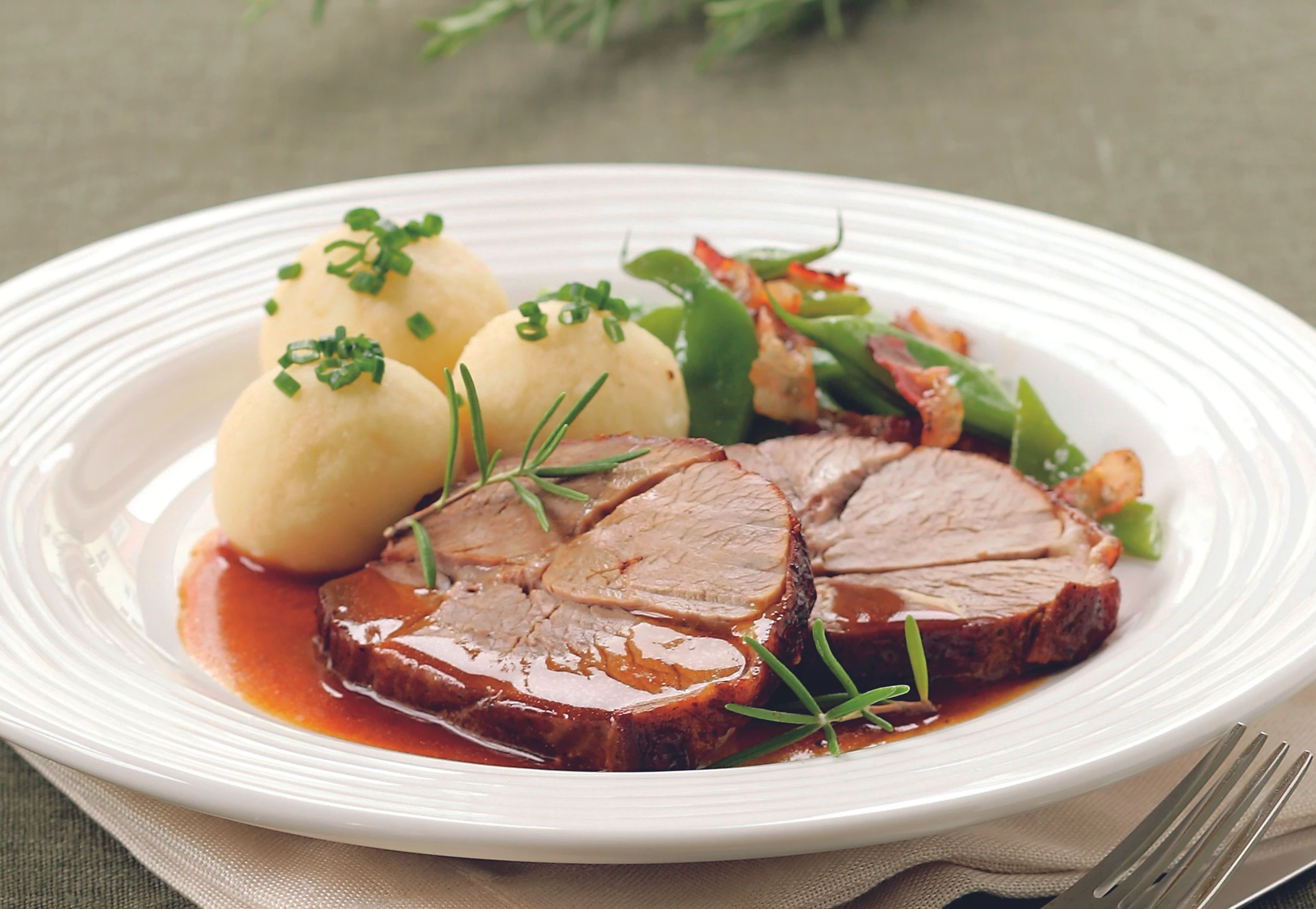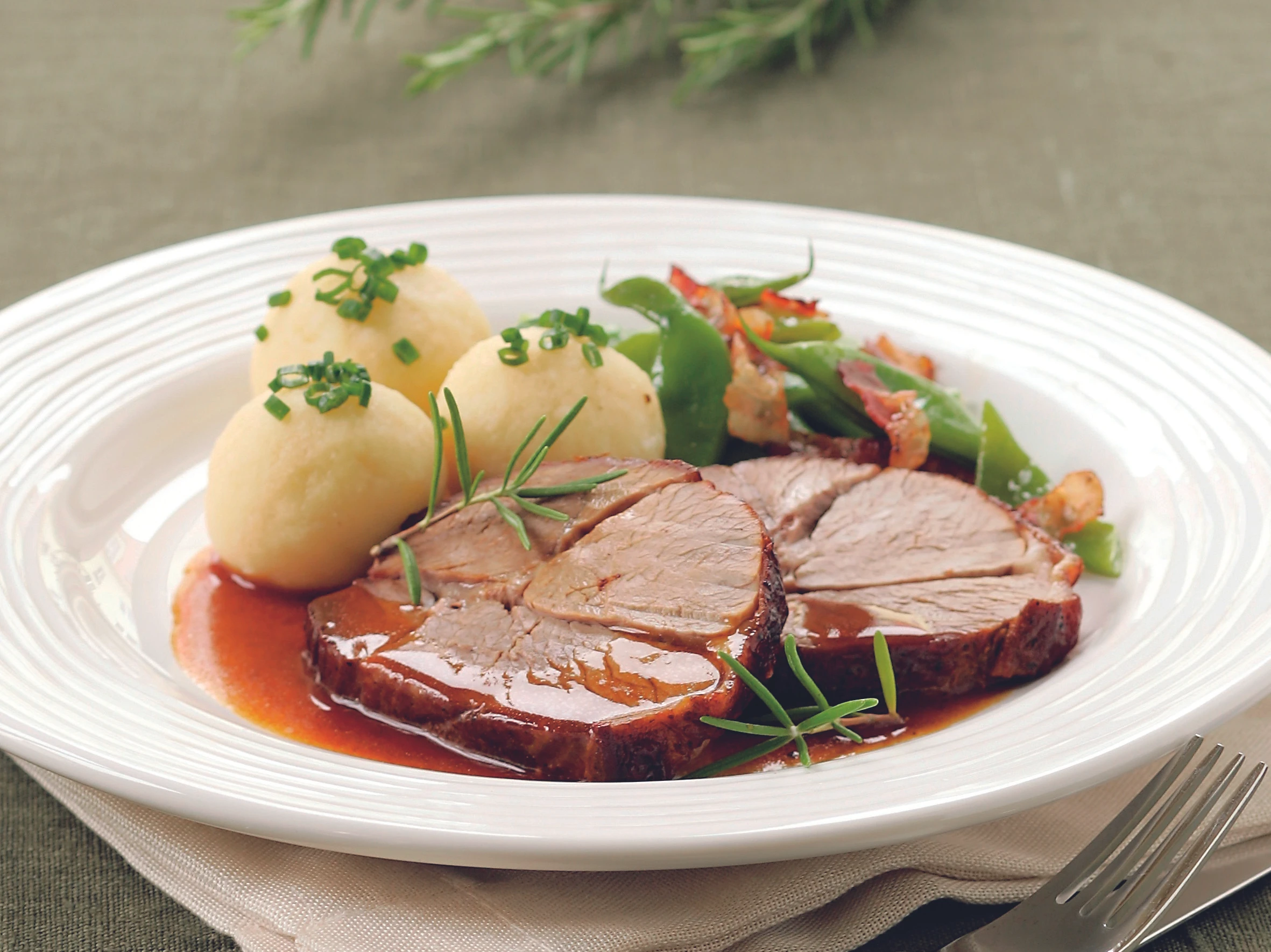 - Bratensaft abseihen. Stärke mit 4 EL Wasser anrühren. Sauce aufkochen und mit der Stärke binden. Fleisch mit der Sauce anrichten.