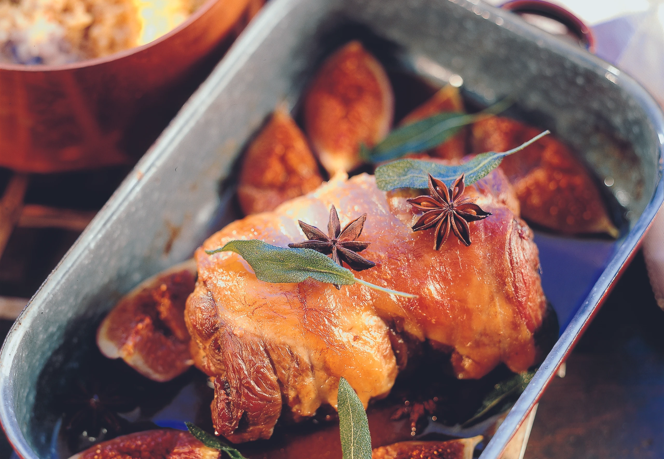 Bratenpfanne säubern (nicht auswaschen, sondern lediglich Knochen- und Bratreste entfernen). Fleisch, Feigen und Anis in die Pfanne geben, Sauce zugießen und den Braten weitere 15 Minuten im Rohr schmoren.
