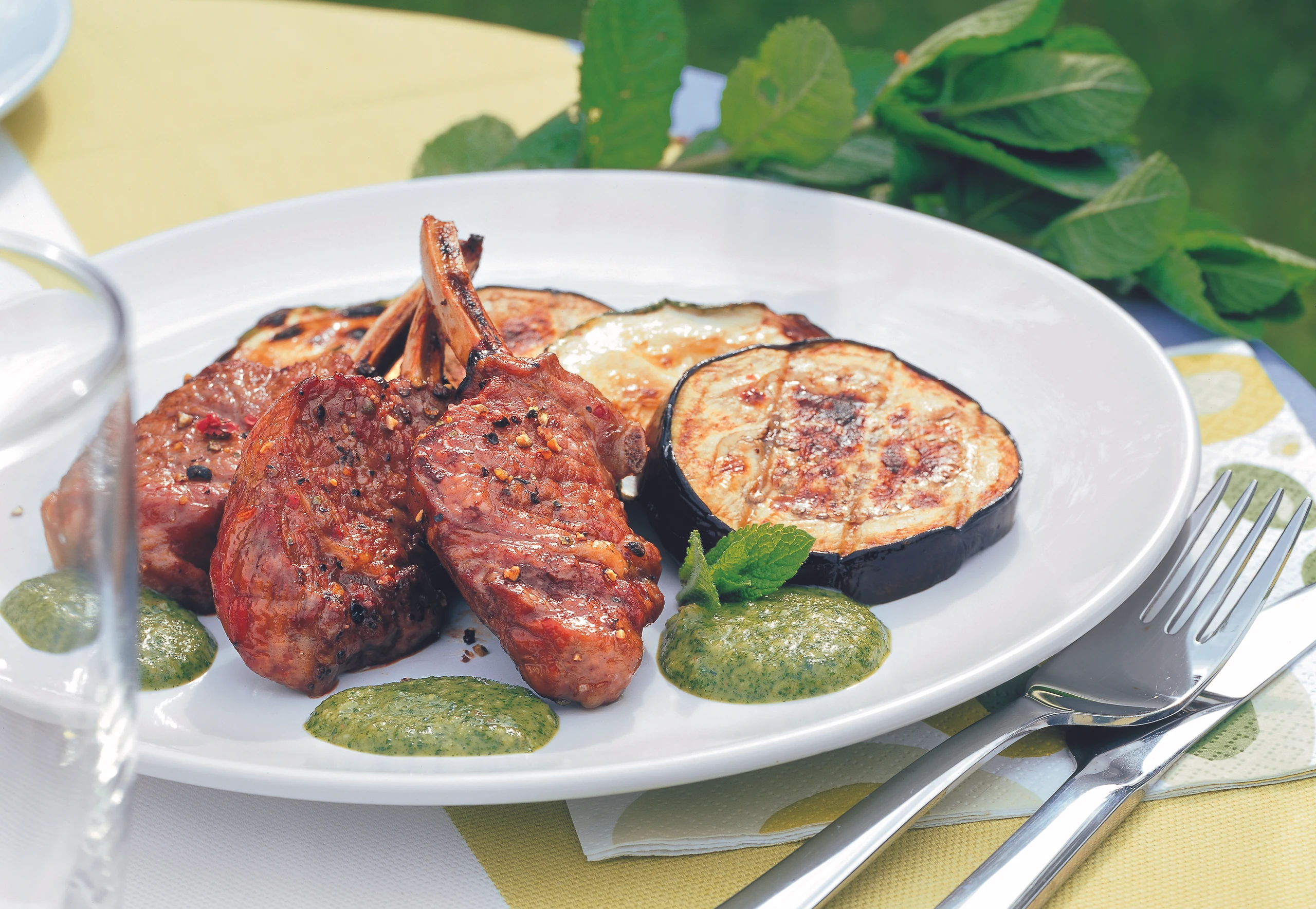 Lammkoteletts mit gegrilltem Gemüse und Minzpesto