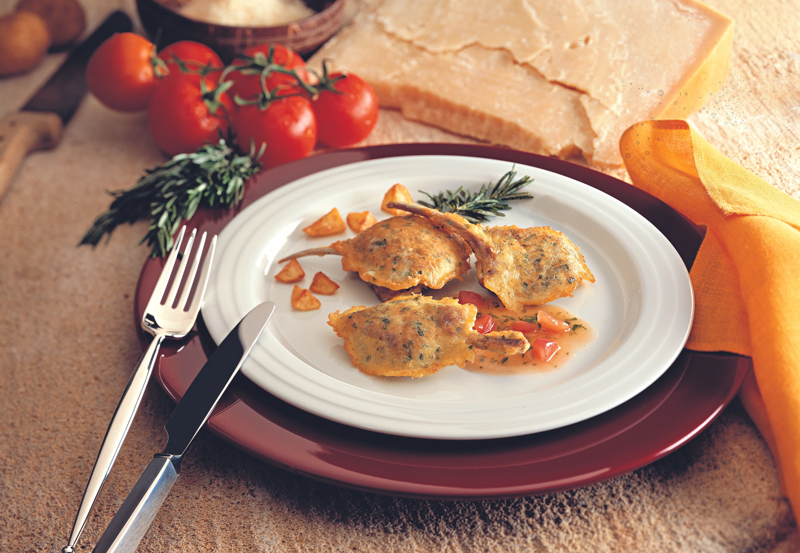 Lammkoteletts in Käsepanier mit warmer Paradeis-Vinaigrette
