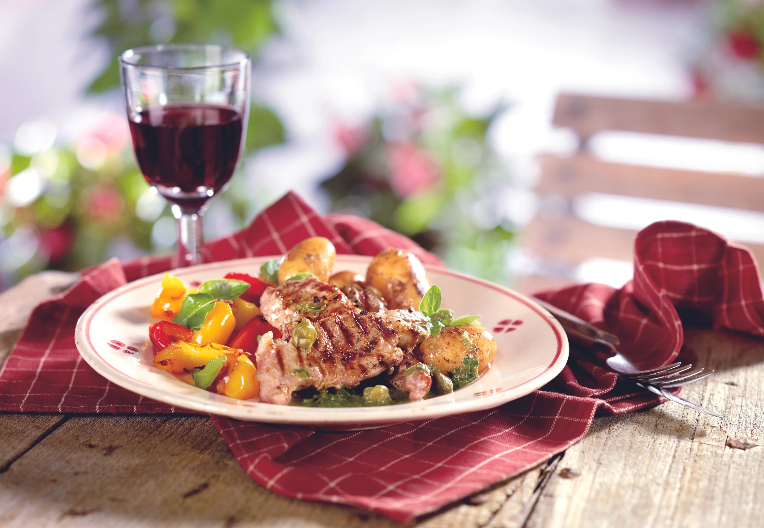 Lammkoteletts mit Kapernsauce, Ofenpaprika und Erdäpfeln