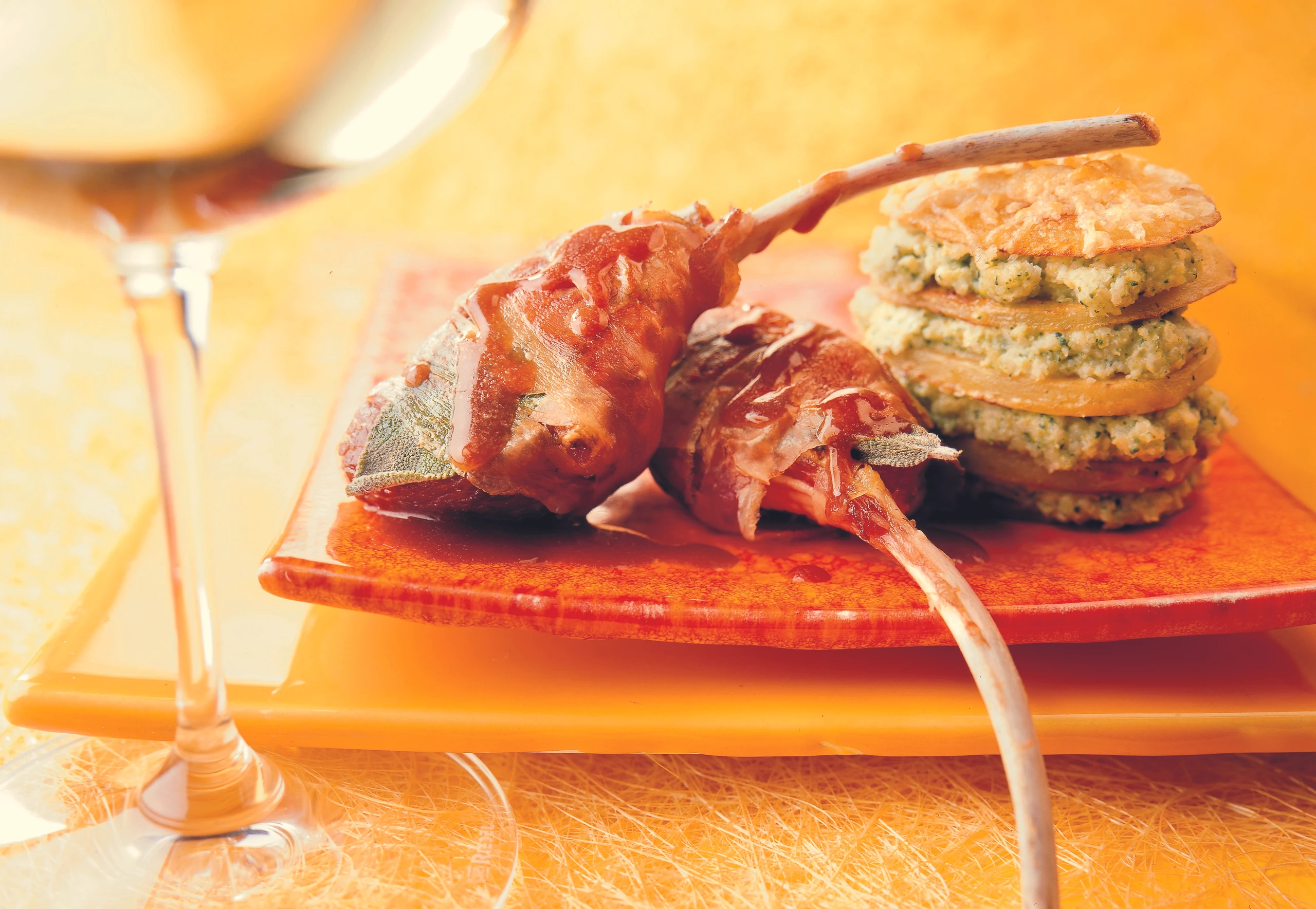 Zahnstocher entfernen, Koteletts mit Sauce und den Türmchen anrichten.