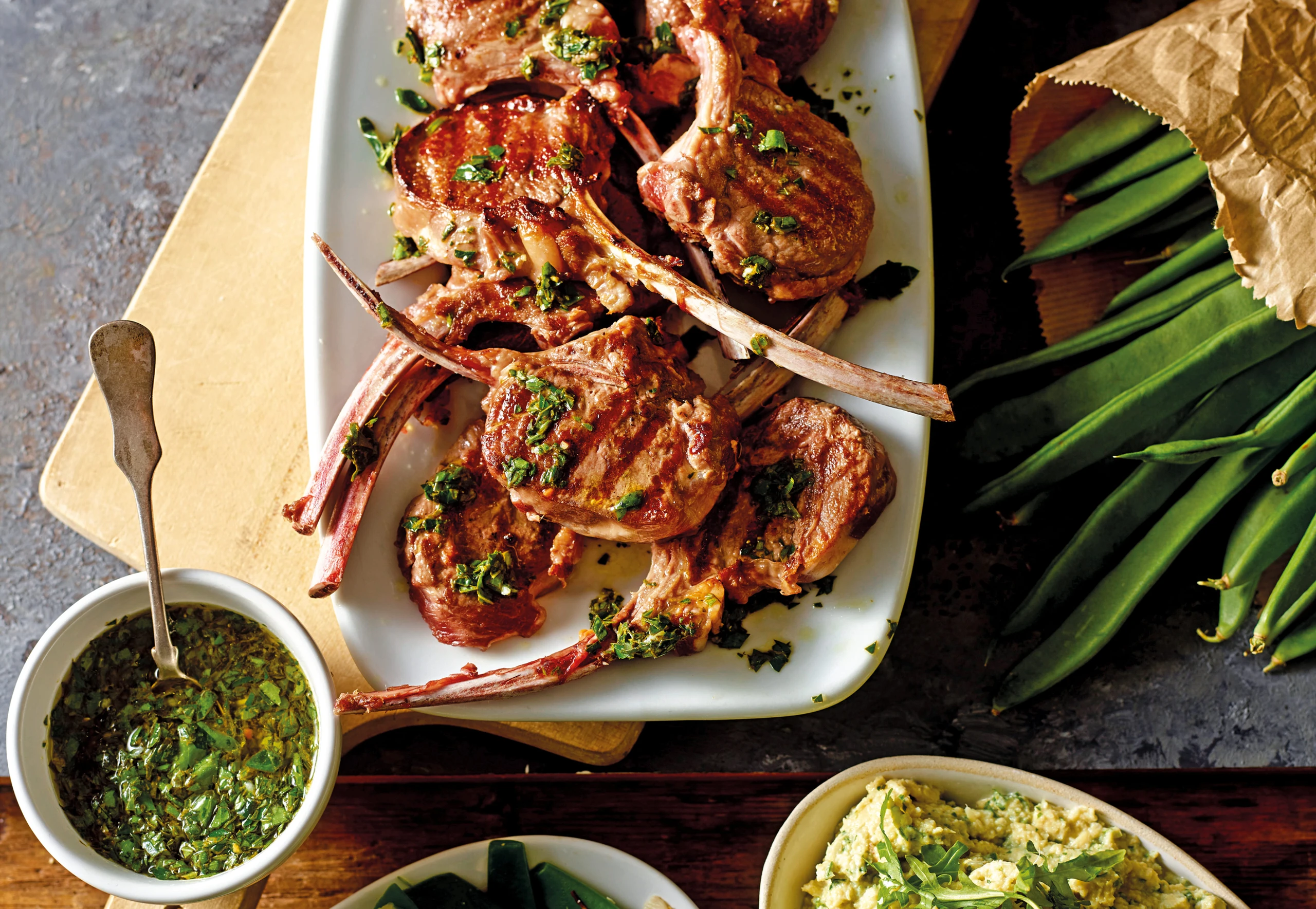 Lammkoteletts mit Salsa verde, Artischockenpüree und Fisolen-Mandelgemüse