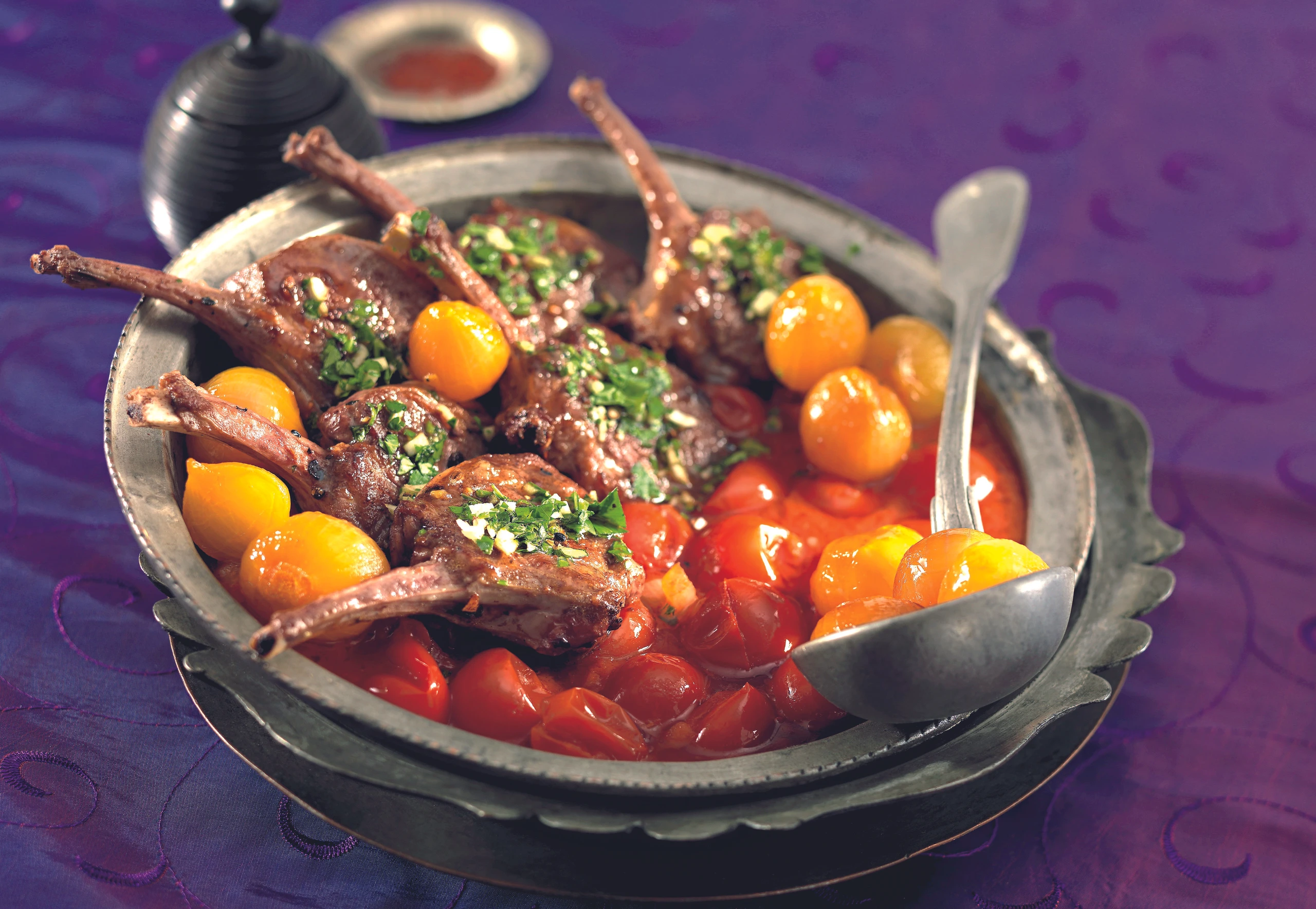 Lammkoteletts mit Zimt-Paradeisern und Safran-Schalotten