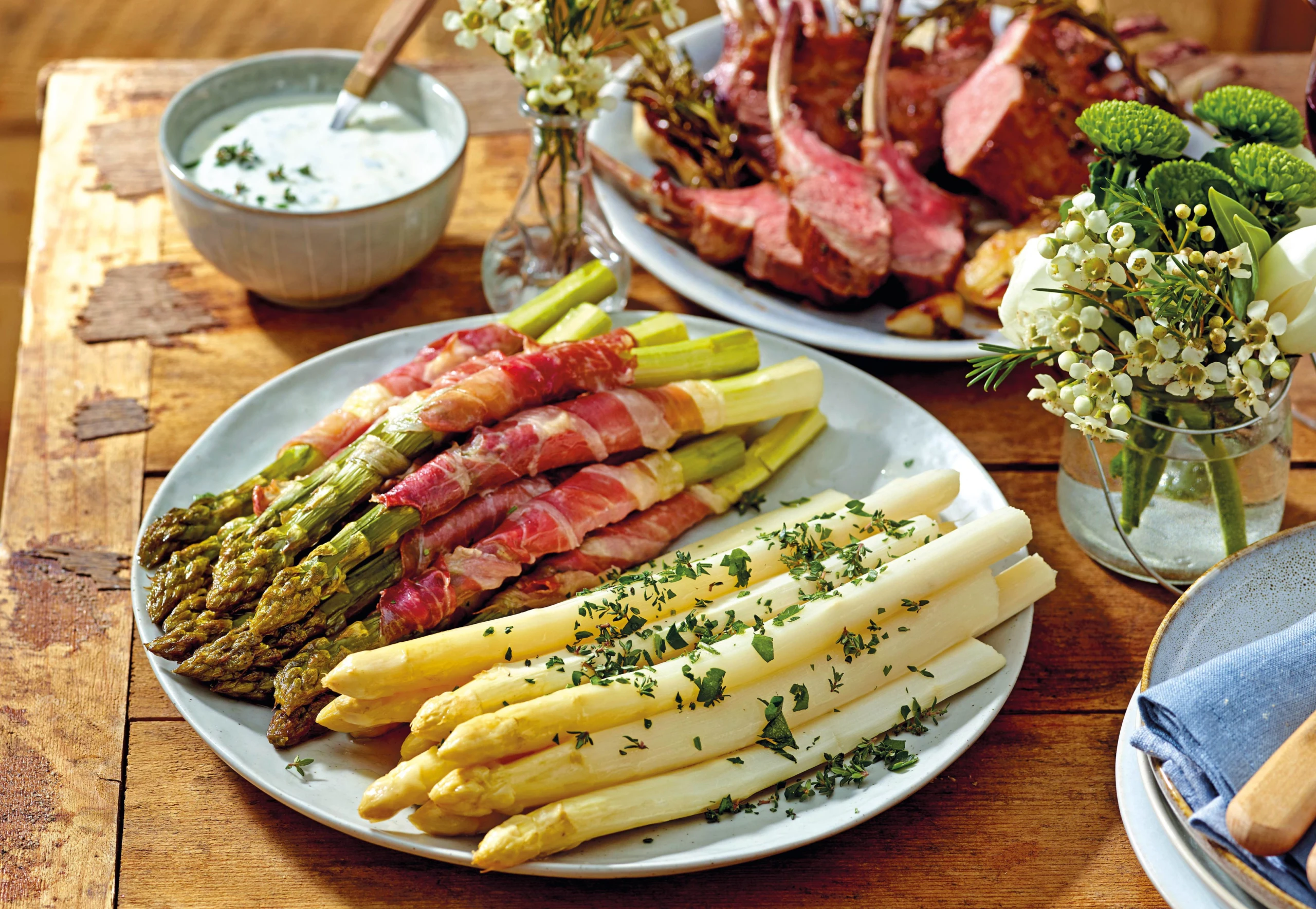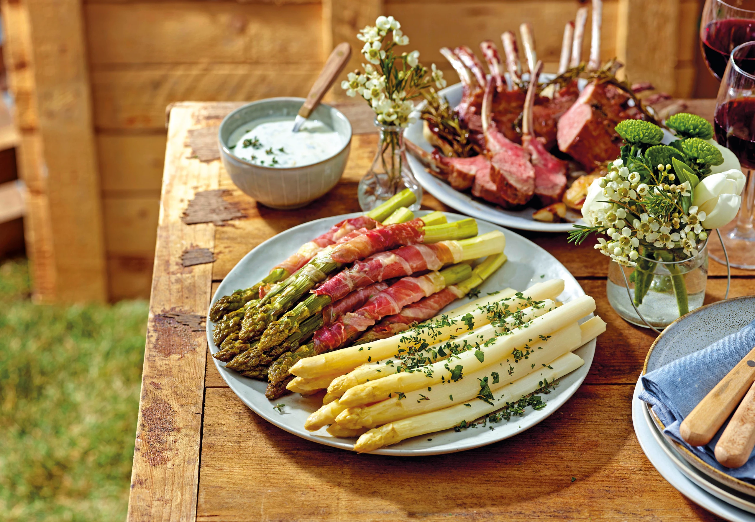 Lammkrone mit Ofenspargel und Zitronen-Joghurtsauce