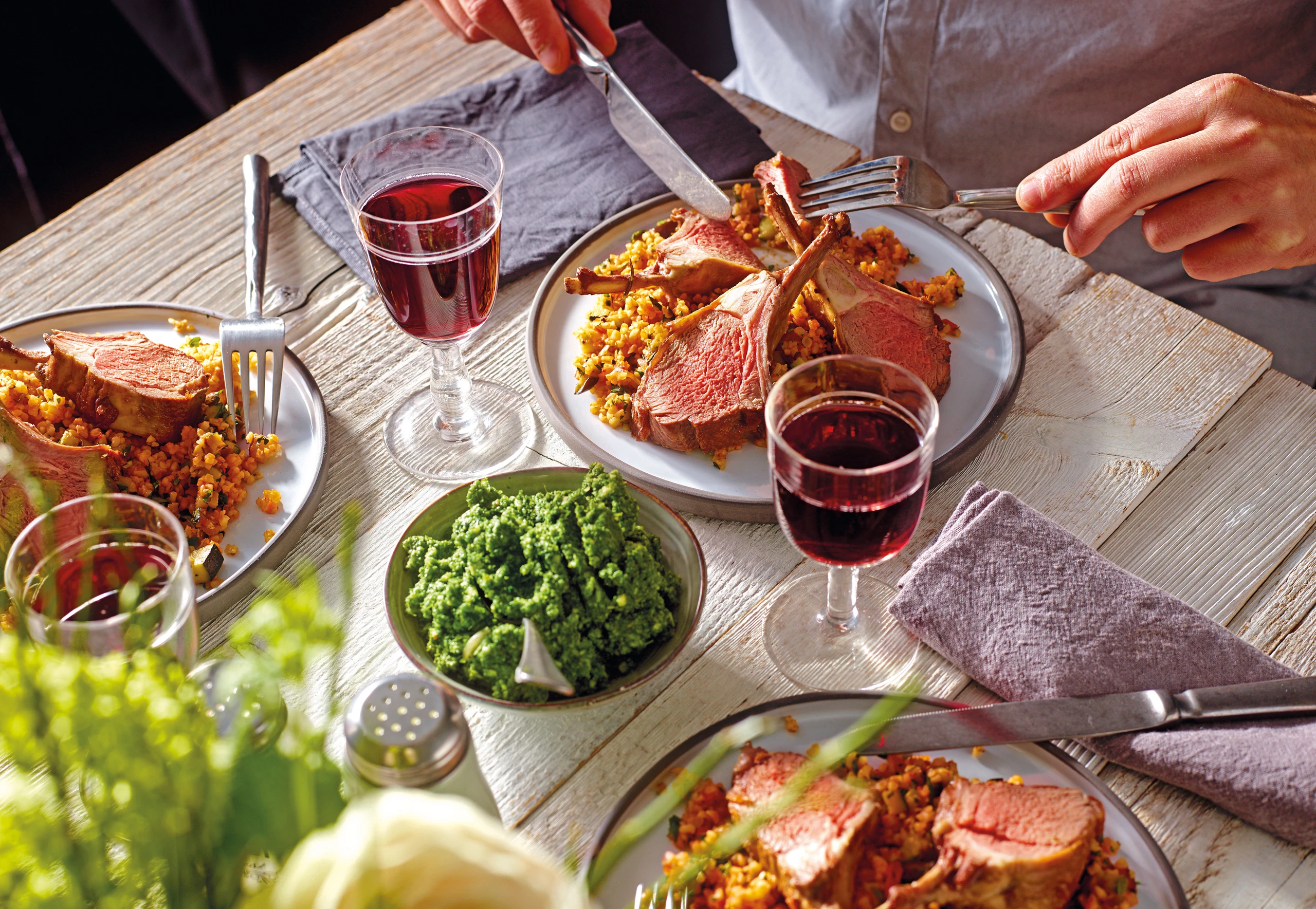 Lammracks mit Spinatpesto und Gemüsebulgur