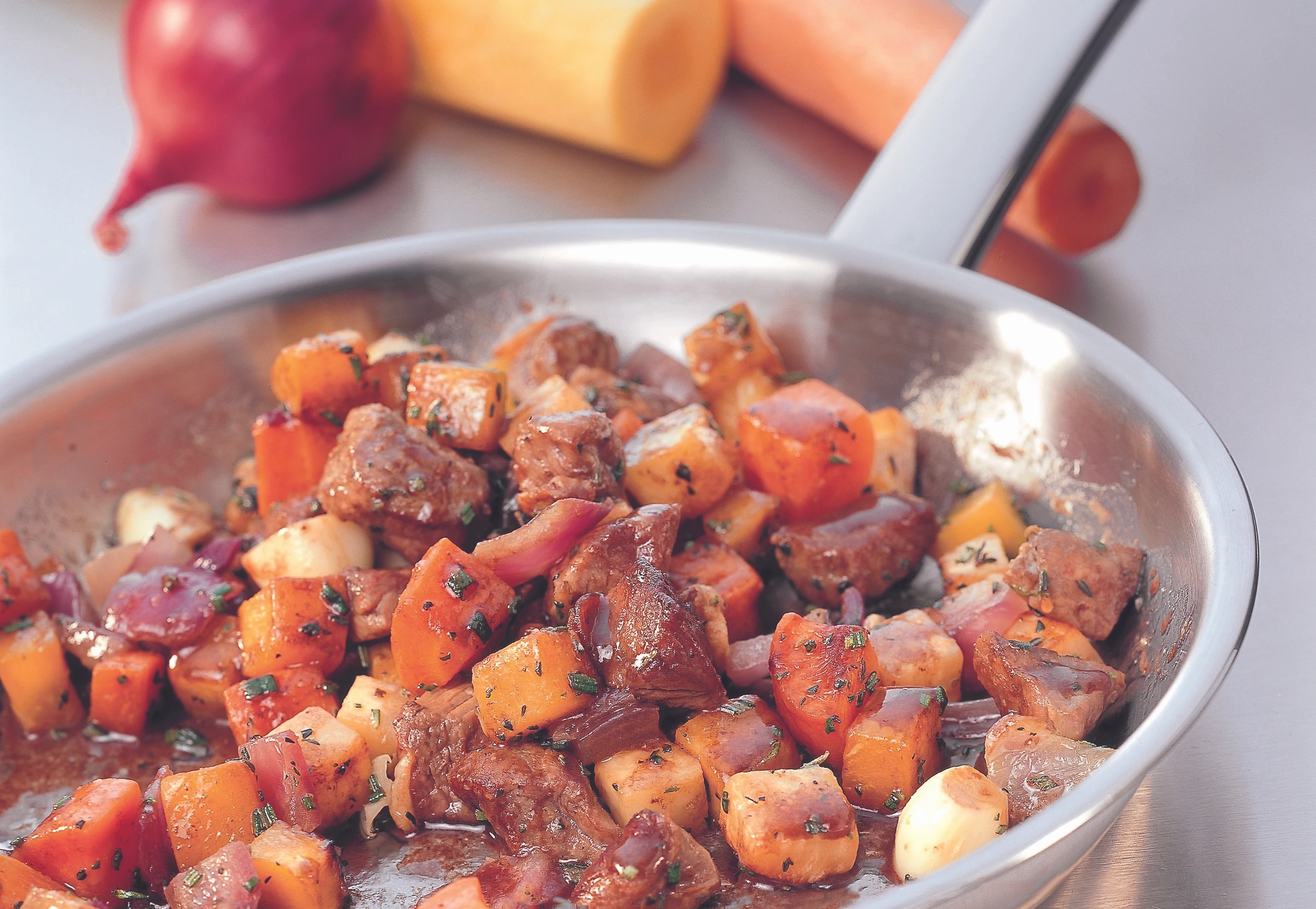 Gemüse putzen und schälen. Fleisch und Gemüse in ca. 1/2 cm große Würfel schneiden. Fleisch in heißem Öl goldbraun anbraten und aus der Pfanne nehmen. Im Bratrückstand Gemüse gut anbraten und aus der Pfanne nehmen. Rückstand mit Wein ablöschen und aufkochen. Fleisch, Rosmarin, Thymian, Lorbeerblatt und zerdrückten Knoblauch zugeben und das Fleisch bei schwacher Hitze ca. 30 Minuten köcheln.