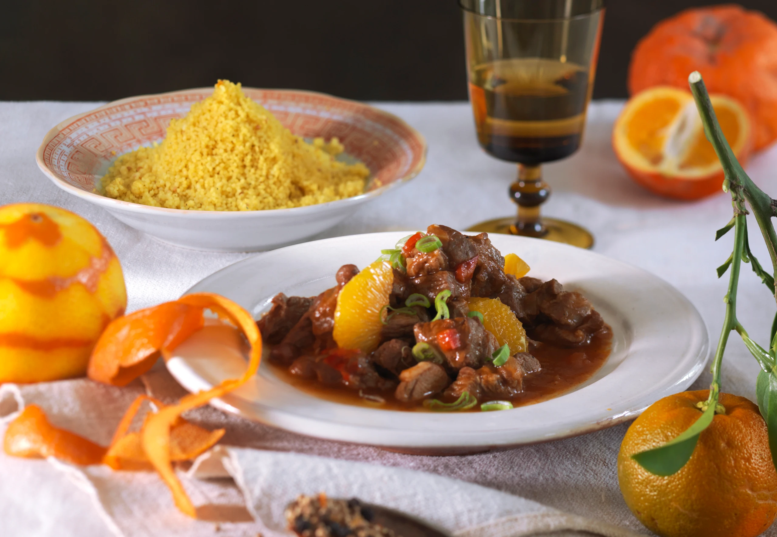 In einem Topf Öl erhitzen, Fleisch darin scharf anbraten, Zwiebeln, Knoblauch, Paradeismark und Orangengewürz zugeben und mitrösten. Mit Gemüsefond ablöschen, Paprika und Sultaninen zugeben und das Fleisch bis auf einen Spalt zugedeckt weich dünsten (ca. 45 Minuten). Deckel entfernen, Saft mollig einkochen lassen.