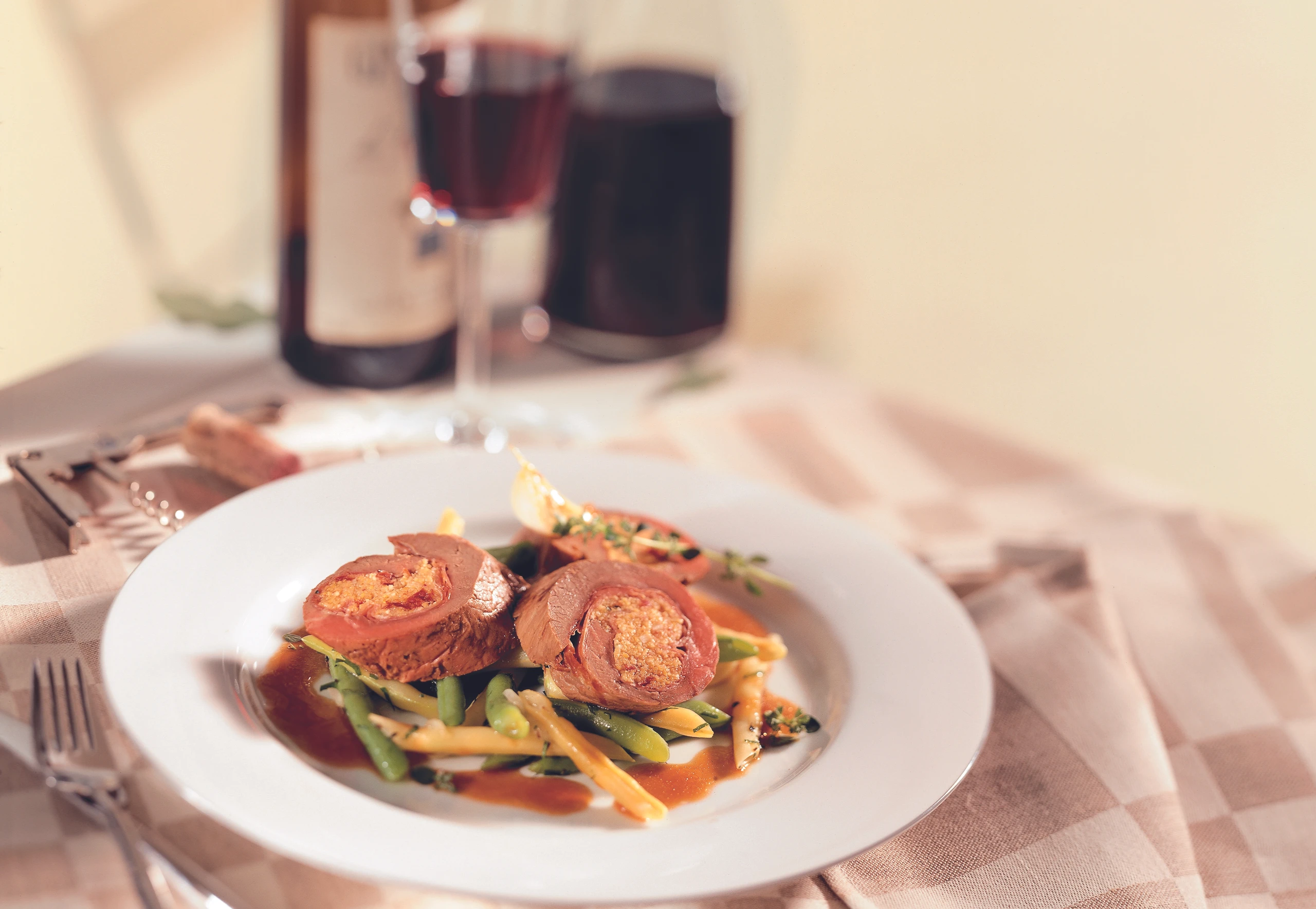 Lammroulade mit Serranoschinken und Paradeiser-Polenta