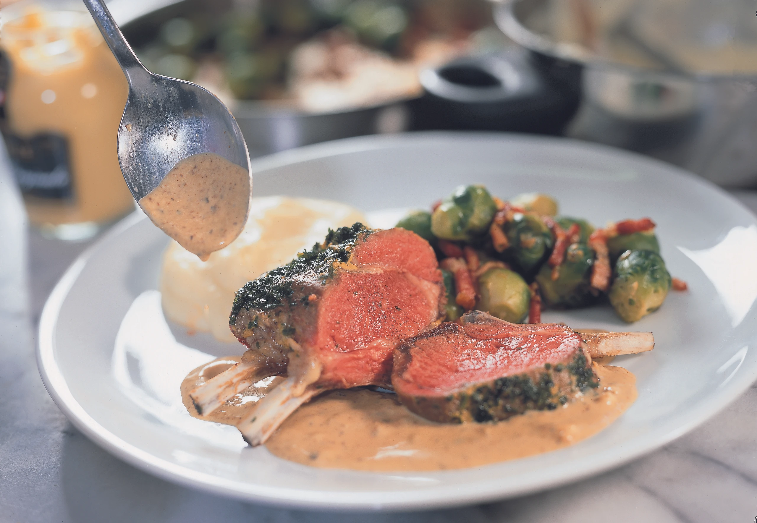Lammrücken mit Senfsauce und Knoblauch-Erdäpfel-Püree