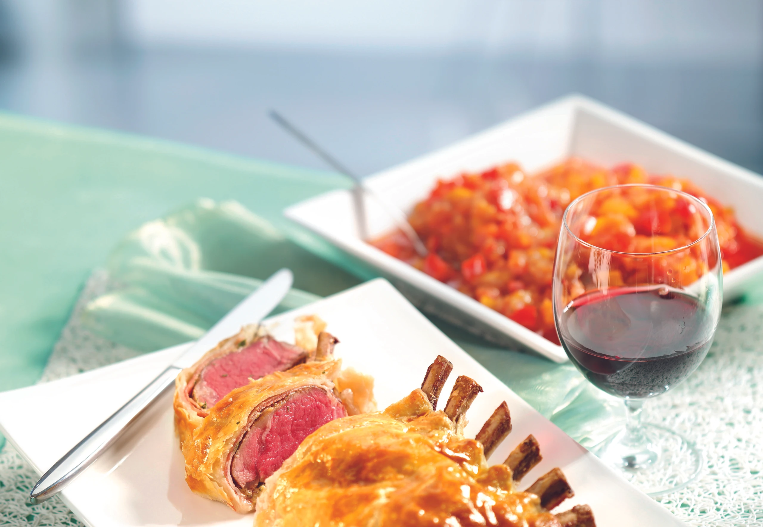 Lammrückenfilet im Blätterteig mit Thymian-Reis und Paprika-Confit