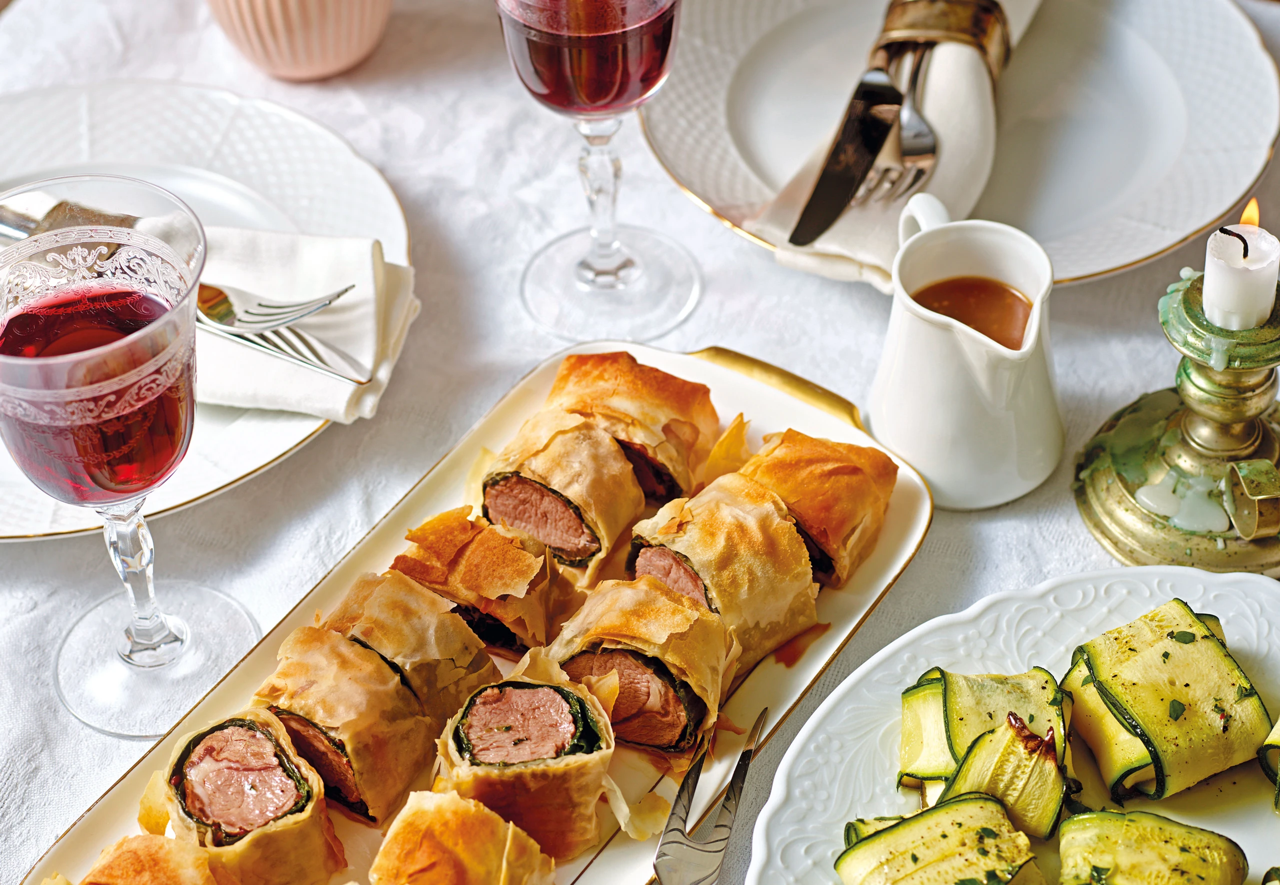 Lammrückenfilet im Strudelteig mit Zucchini-Feta-Päckchen