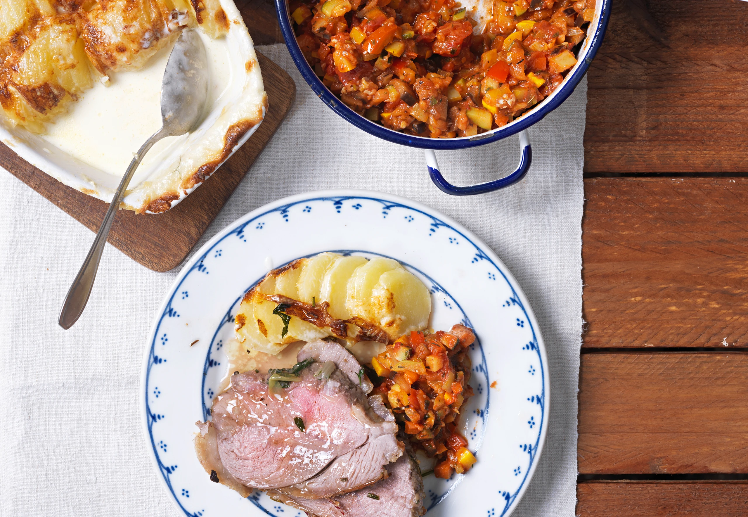 Für die Erdäpfel eine Auflaufform mit Butter und zerdrücktem Knoblauch ausstreichen. Milch und Obers versprudeln, mit Salz, Pfeffer und Muskat würzen. Erdäpfel schälen, in 4 mm dicke Scheiben schneiden und in die Form schichten. Mit der Milch-Obersmischung übergießen, mit Käse bestreuen und zum Lamm ins Rohr stellen und ca. 50 Minuten mitgaren.