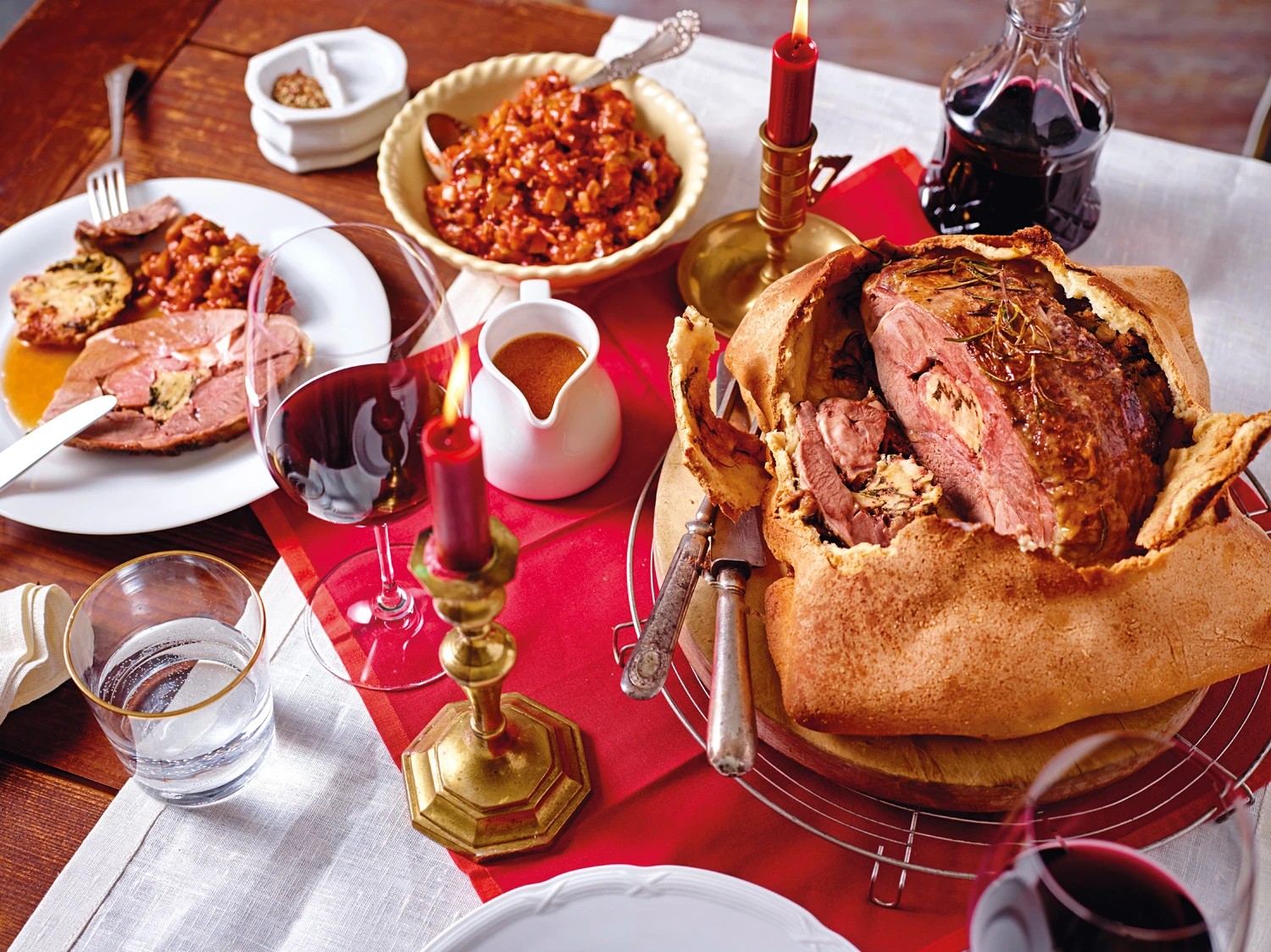 Für den Teig alle Zutaten glatt verkneten. Backblech mit Backpapier belegen. Teig auf einer bemehlten Arbeitsfläche ausrollen (ca. 40 x 50 cm). Fleisch in die Mitte setzen, mit Rosmarinzweigen belegen, im Teig einschlagen, rundum gut verschließen und mit der Verschlussseite nach unten auf das Blech legen. An der Oberseite 1 Loch (Ø ca. 4 cm) in den Teig stechen. Fleisch im Rohr (untere Schiene) ca. 90 Minuten garen.