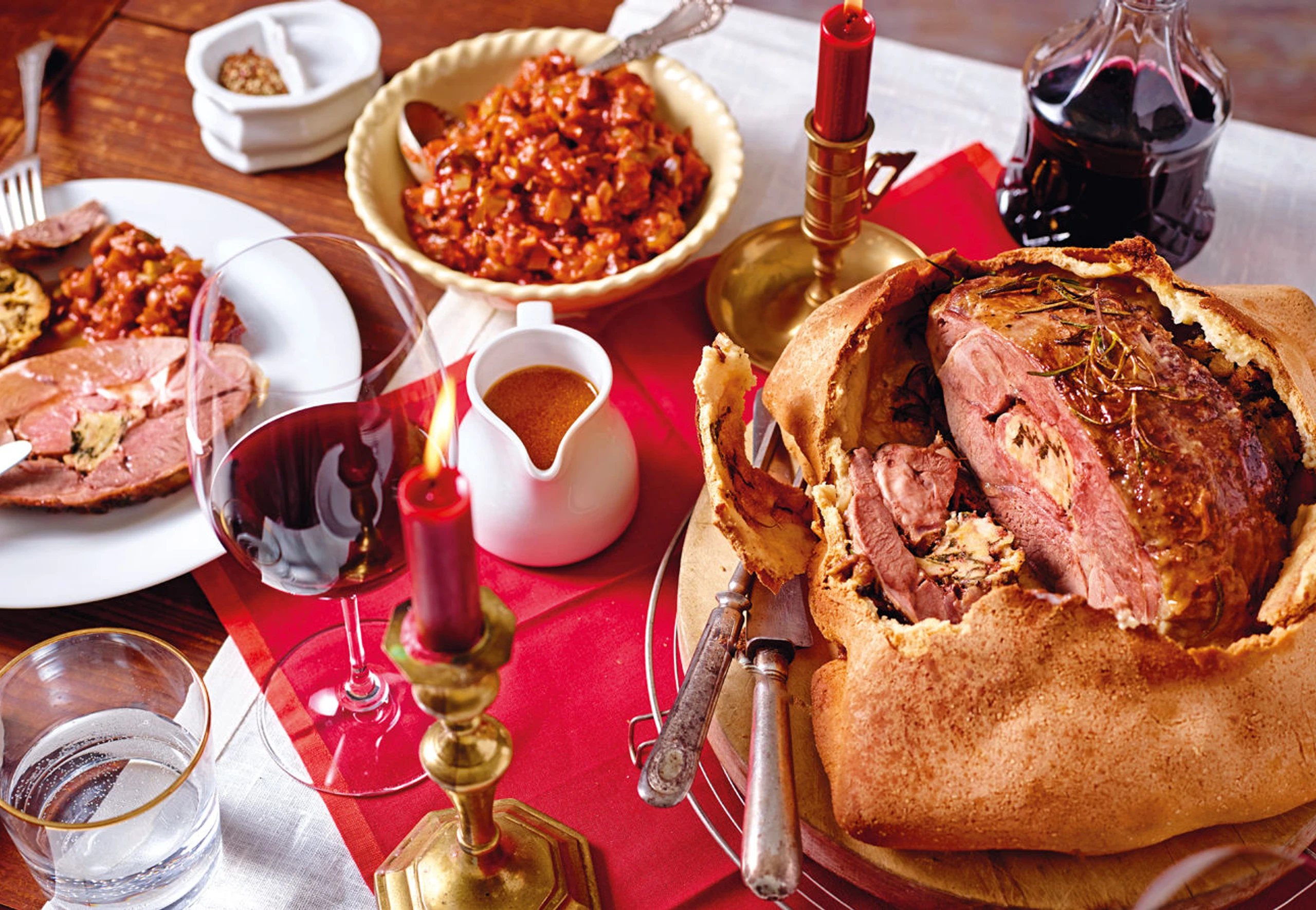Lamm aus dem Rohr nehmen und den Teig mit einem Schnitzelklopfer aufschlagen. Spagat entfernen. Lamm portionieren und mit Sauce und Ratatouille servieren.