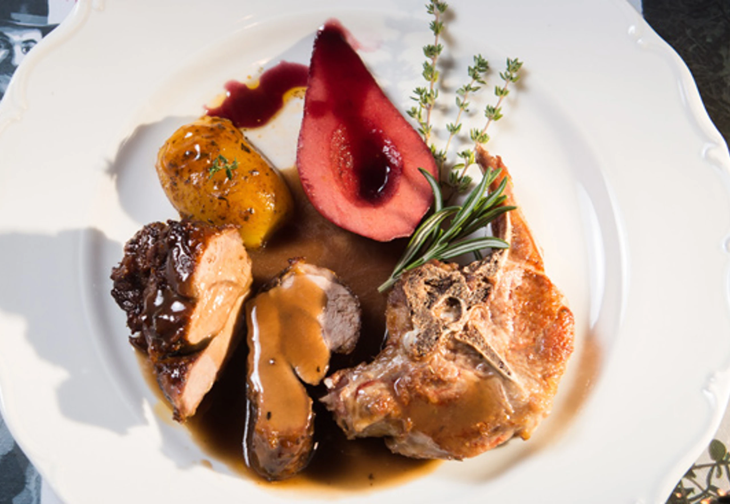 - Erdäpfel zu den Koteletts in die Pfanne geben und erwärmen. Lammschulter aus der Pfanne nehmen und warm stellen. Bratensaft abseihen und mit 1 Schuss Rotwein verfeinern. Schulter in Scheiben schneiden und mit Koteletts, Sauce und Erdäpfeln anrichten und eventuell mit Preiselbeeren und Kompottbirnen servieren.