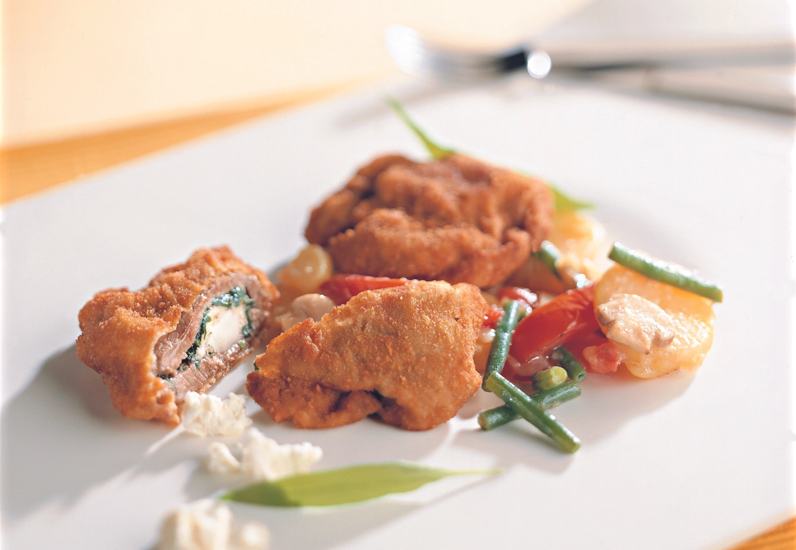Schnitzel etwas klopfen, mit Salz, Pfeffer, zerdrücktem Knoblauch und Thymian würzen. Schnitzel mit Käse und Bärlauch belegen, zusammenklappen, Ränder mit dem Messerrücken gut zusammendrücken.