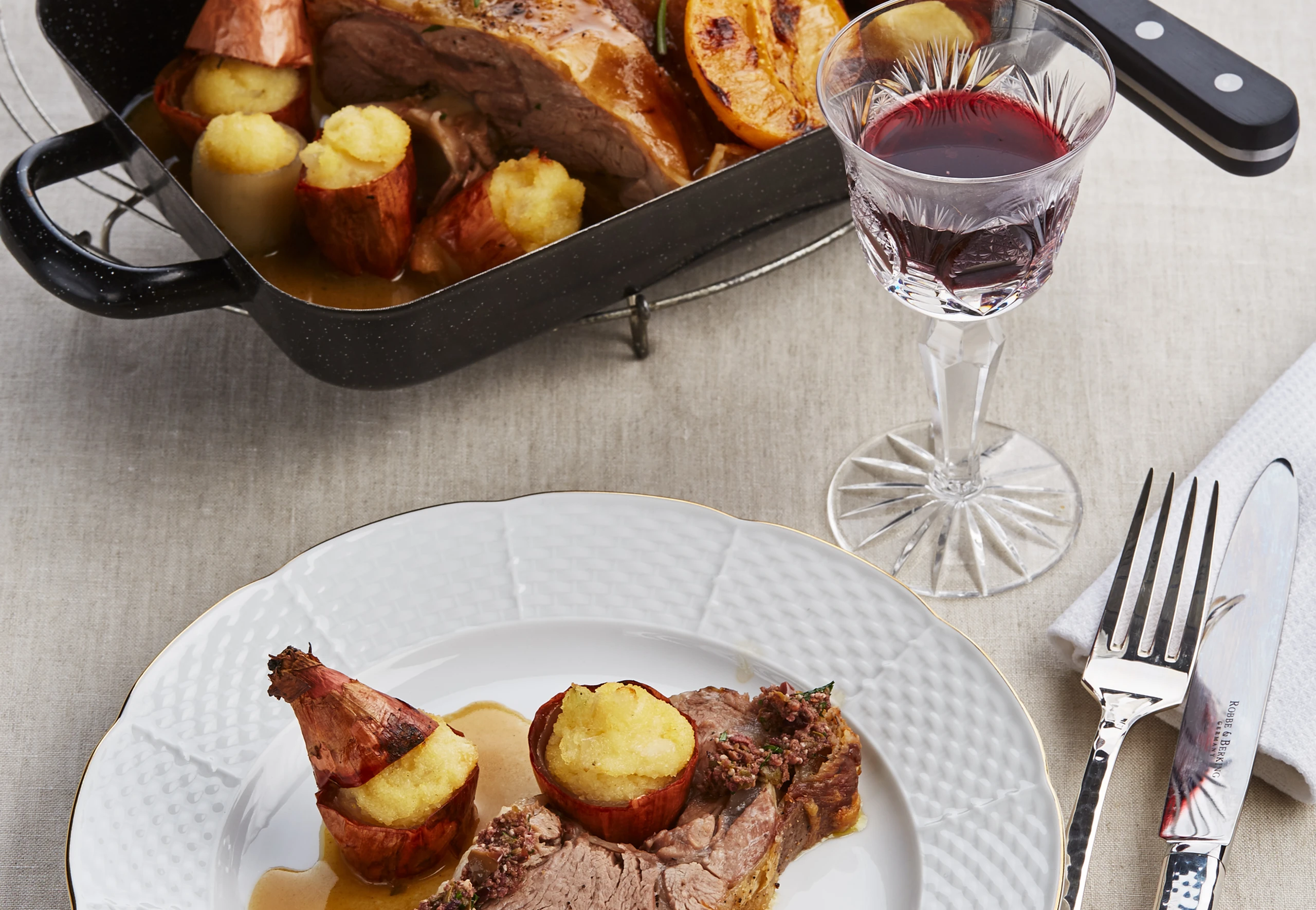 - Fleisch in Scheiben schneiden und mit Sauce, Tapenade und den gefüllten Schalotten anrichten.