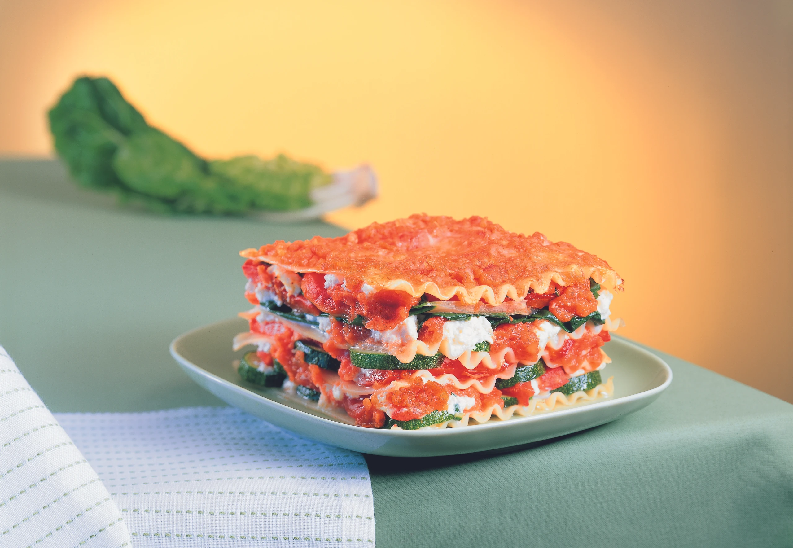 Backrohr nochmals auf 200 °C aufheizen. Den Boden einer Auflaufform mit den Lasagneblättern auslegen. Nun abwechselnd leicht gesalzenes Gemüse, Lasagneblätter und Paradeissauce in die Form geben. Restliche Sauce darauf verteilen, mit dem restlichen Käse bestreuen. Lasagne ca. 30 Minuten im vorgeheizten Rohr (unterste Schiene) backen. Wenn die Lasagne zu dunkel wird, mit Alufolie abdecken.