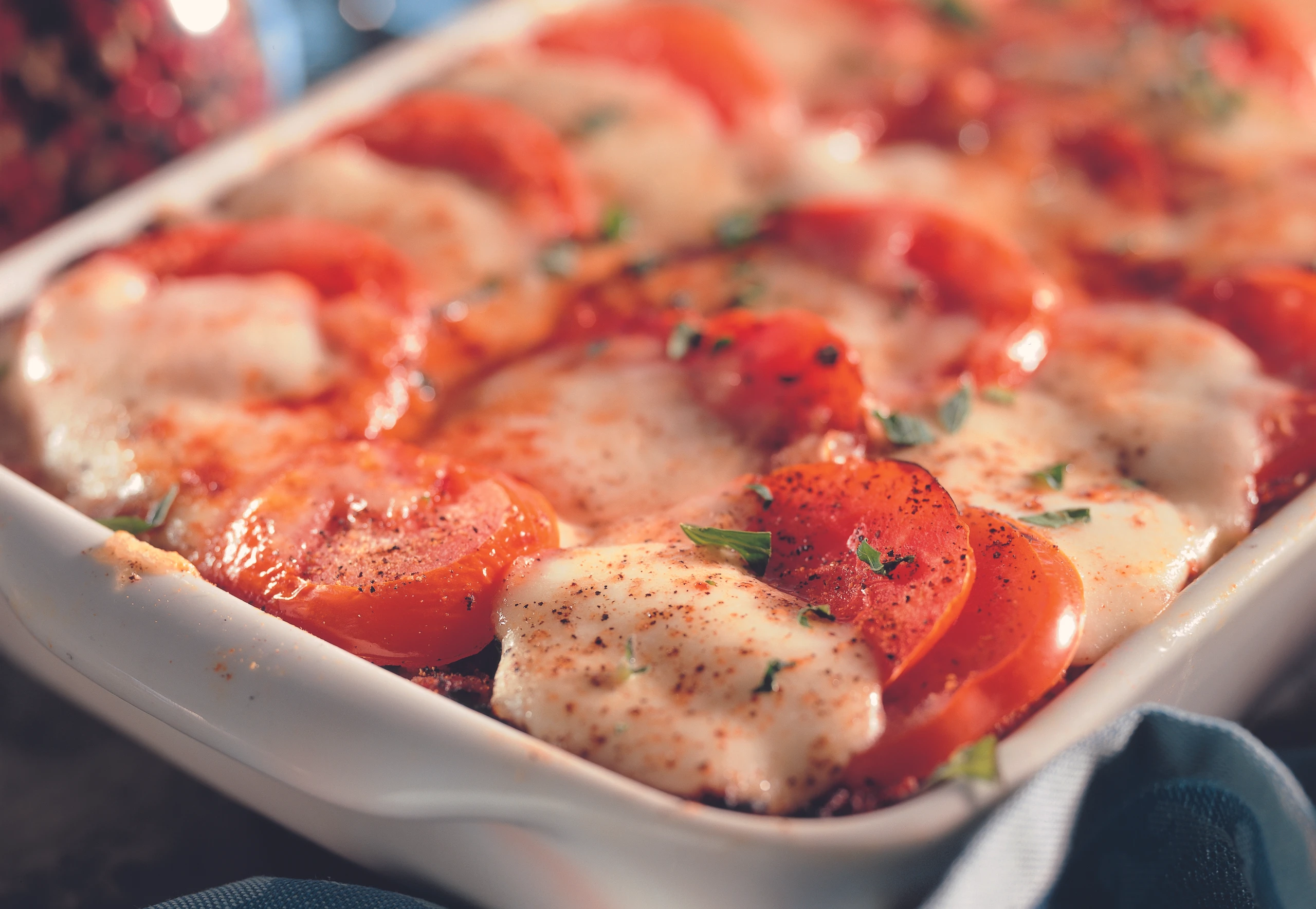 Auflauf mit Mozzarella- und Paradeiserscheiben belegen, mit Salz, Pfeffer, Oregano und Parmesan bestreuen und ca. 50 Minuten (unterste Schiene / Gitterrost) backen.