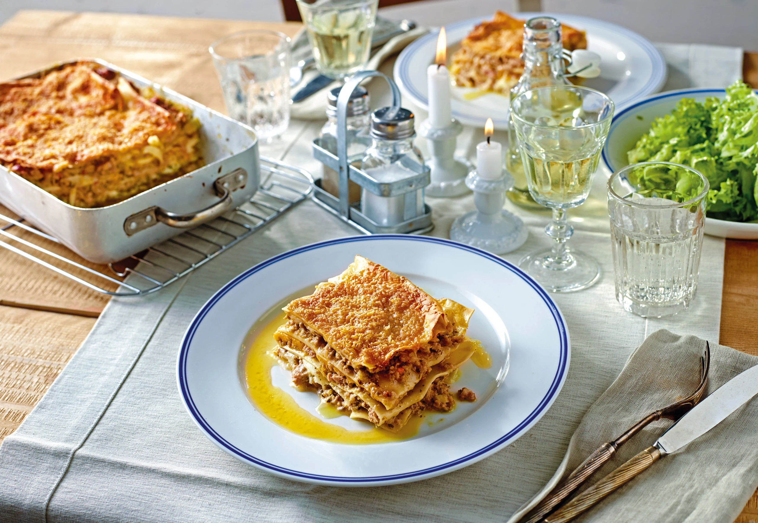 Lasagne aus dem Rohr nehmen und kurz rasten lassen. Salat marinieren. Lasagne portionieren und mit dem Salat servieren.