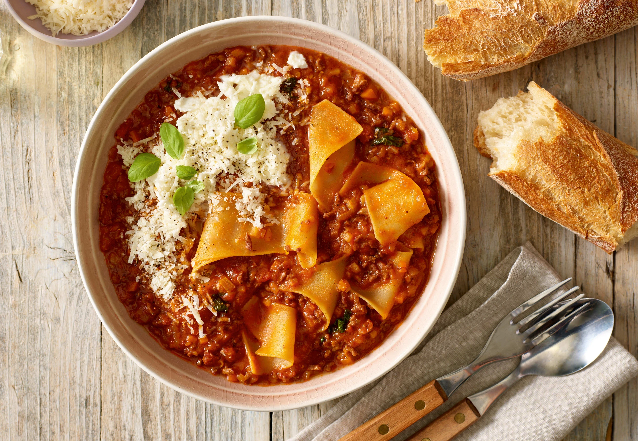 Olivenöl in einem Topf erhitzen, Zwiebel, Knoblauch und Suppengrün darin anschwitzen. Tomatenmark unterrühren, kurz mitbraten. Faschiertes zugeben. Kräftig anbraten und mit Salz, Pfeffer, Chiliflocken, Oregano und Basilikum abschmecken.