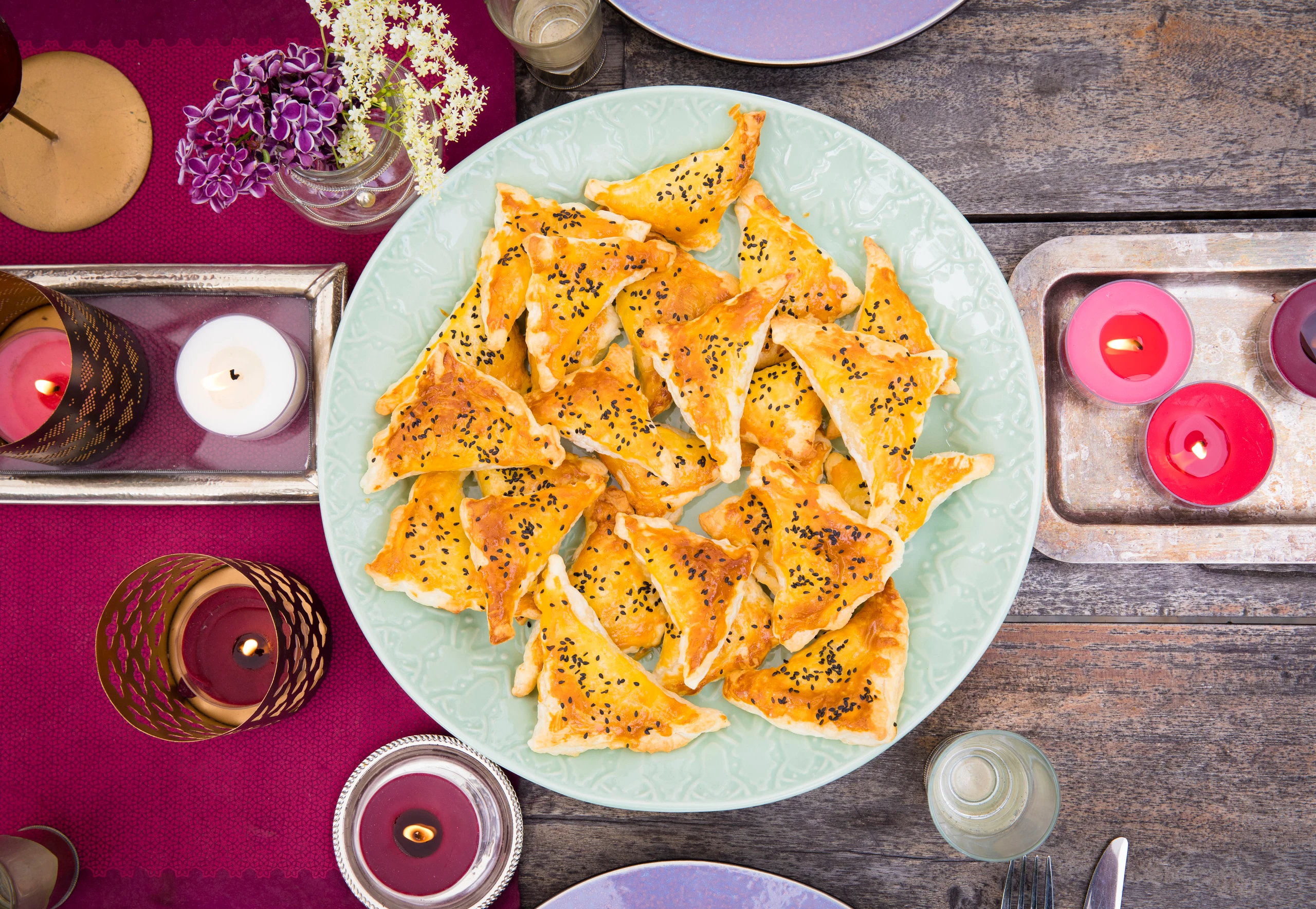 Blätterteige aufrollen, in jeweils 15 3 x 5 große Rechtecke schneiden. Fülle mittig auf die Rechtecke geben, Ränder mit flüssiger Butter einstreichen und so zusammenklappen, dass Dreiecke entstehen. Rechtecke mit verquirltem Ei bestreichen und mit Sesam bestreuen.