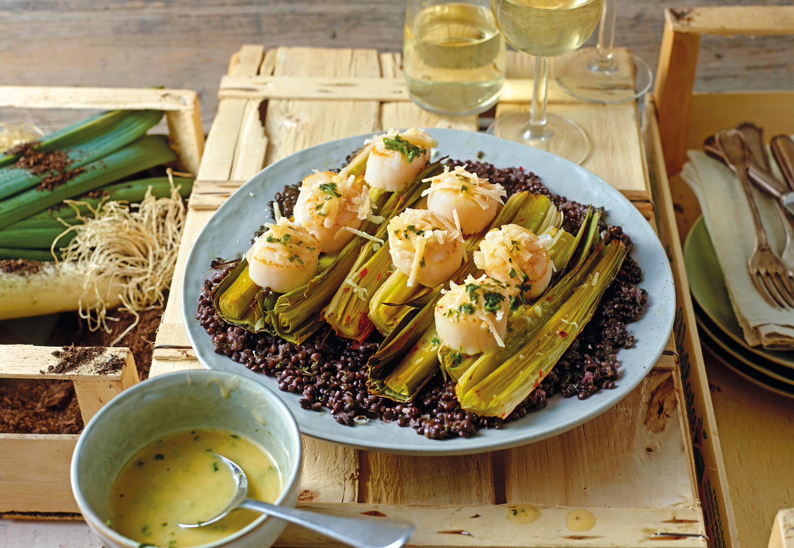 Lauchschiffchen mit Zitronen-Linsensalat und Jakobsmuscheln