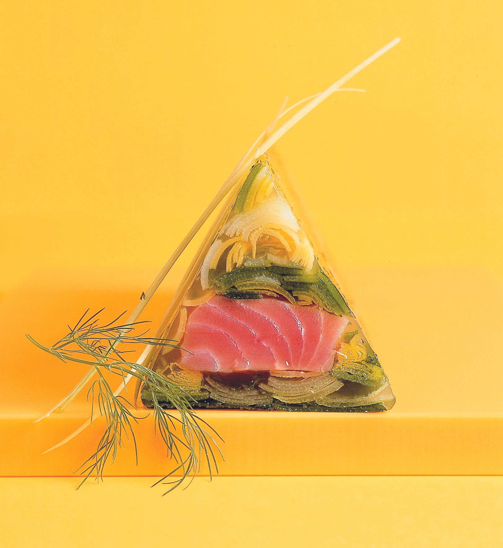 Die Hälfte vom Lauch in die Form legen und mit Fond gut bedeckt aufgießen. Lachs einlegen, mit übrigem Lauch belegen und mit Fond bis zum Rand auffüllen. Terrine mit Frischhaltefolie zudecken und ca. 10 Stunden kühlen.