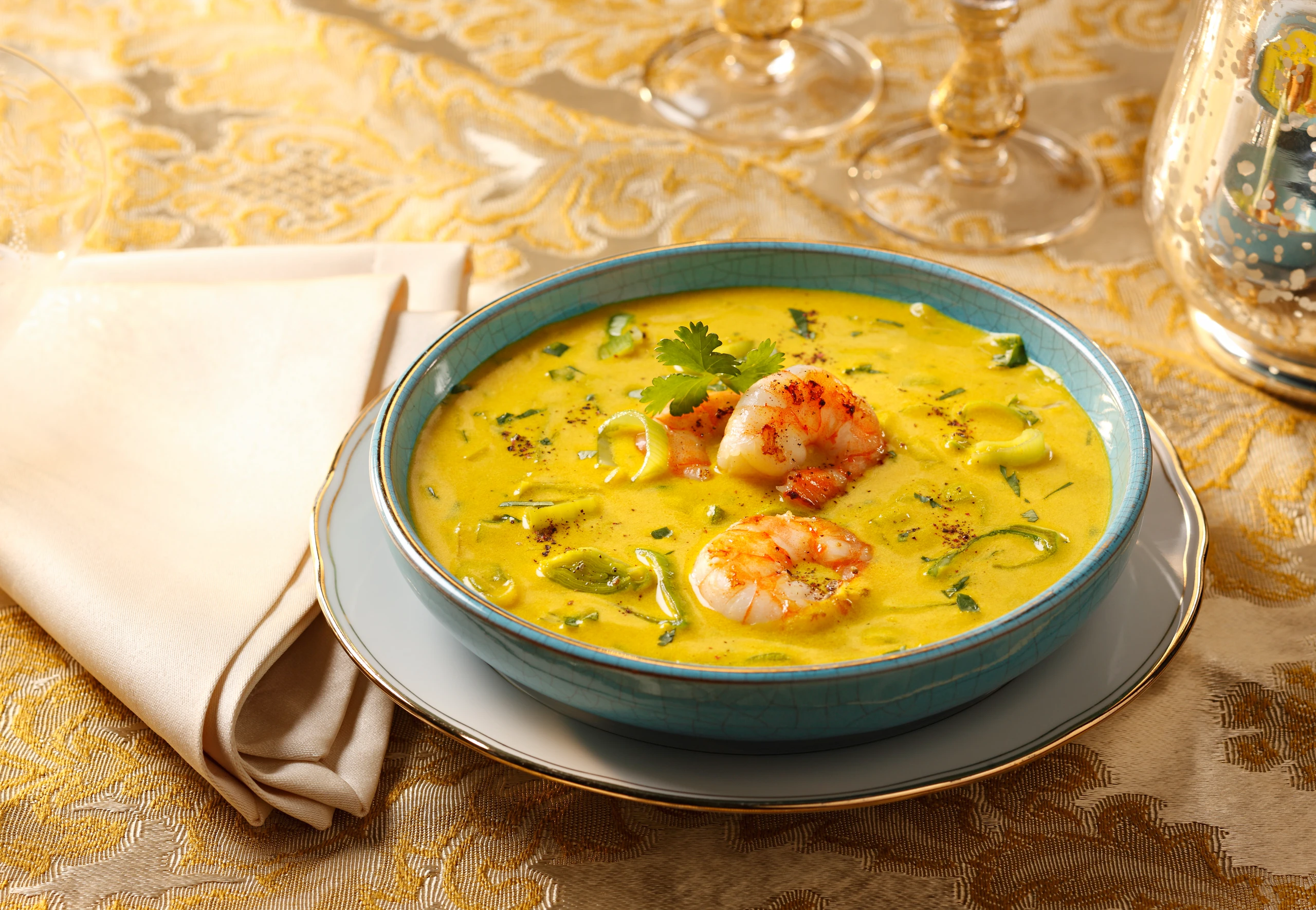 Lauch längs aufschneiden, waschen und quer in 0,5 cm dicke Ringe schneiden. Lauch in der Butter anschwitzen, Curry einrühren, mit Wein ablöschen und mit Suppe aufgießen. Suppe ca. 5 Minuten köcheln.