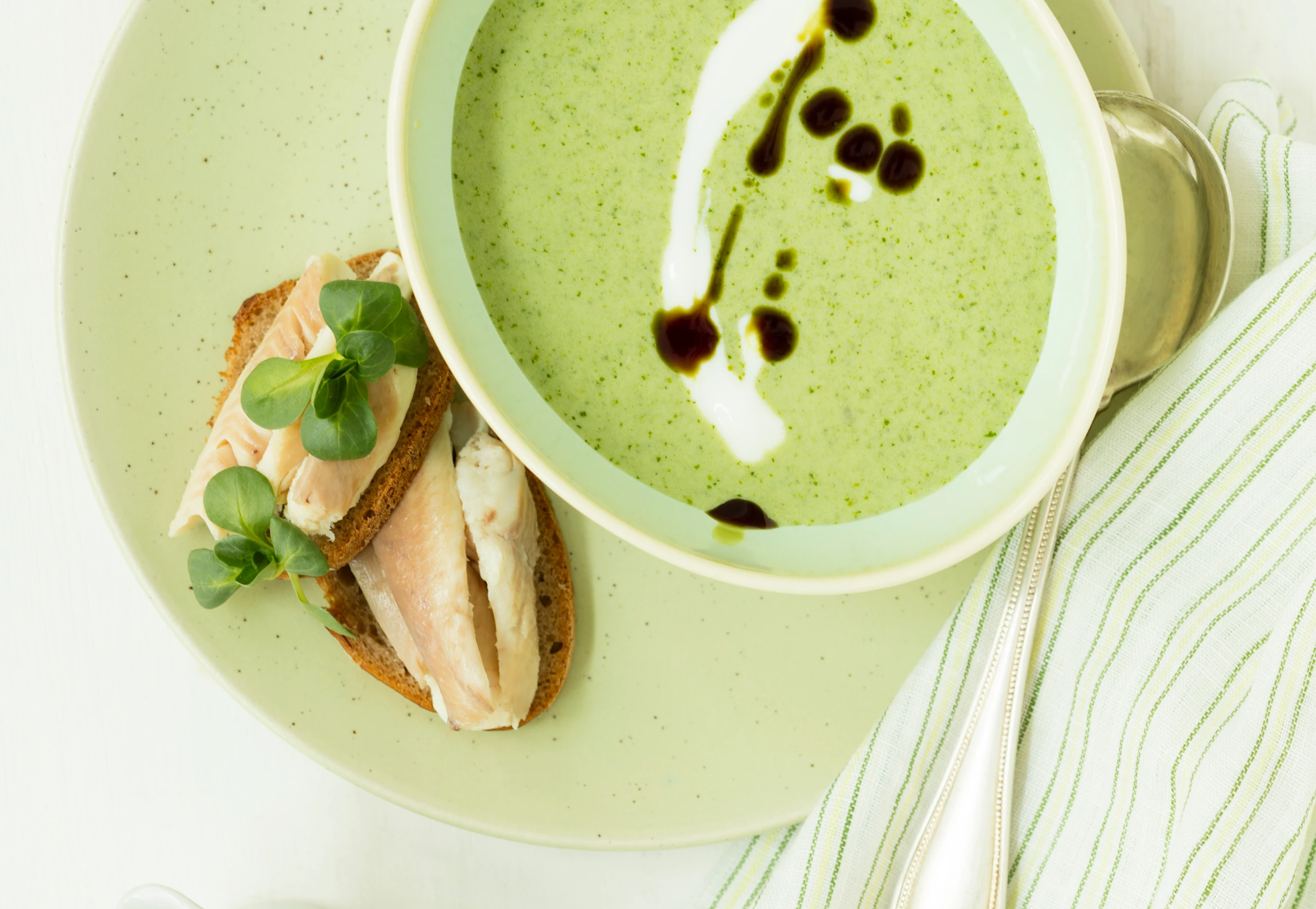 Lauwarme Joghurt-Salatsuppe mit Fisch-Crostini