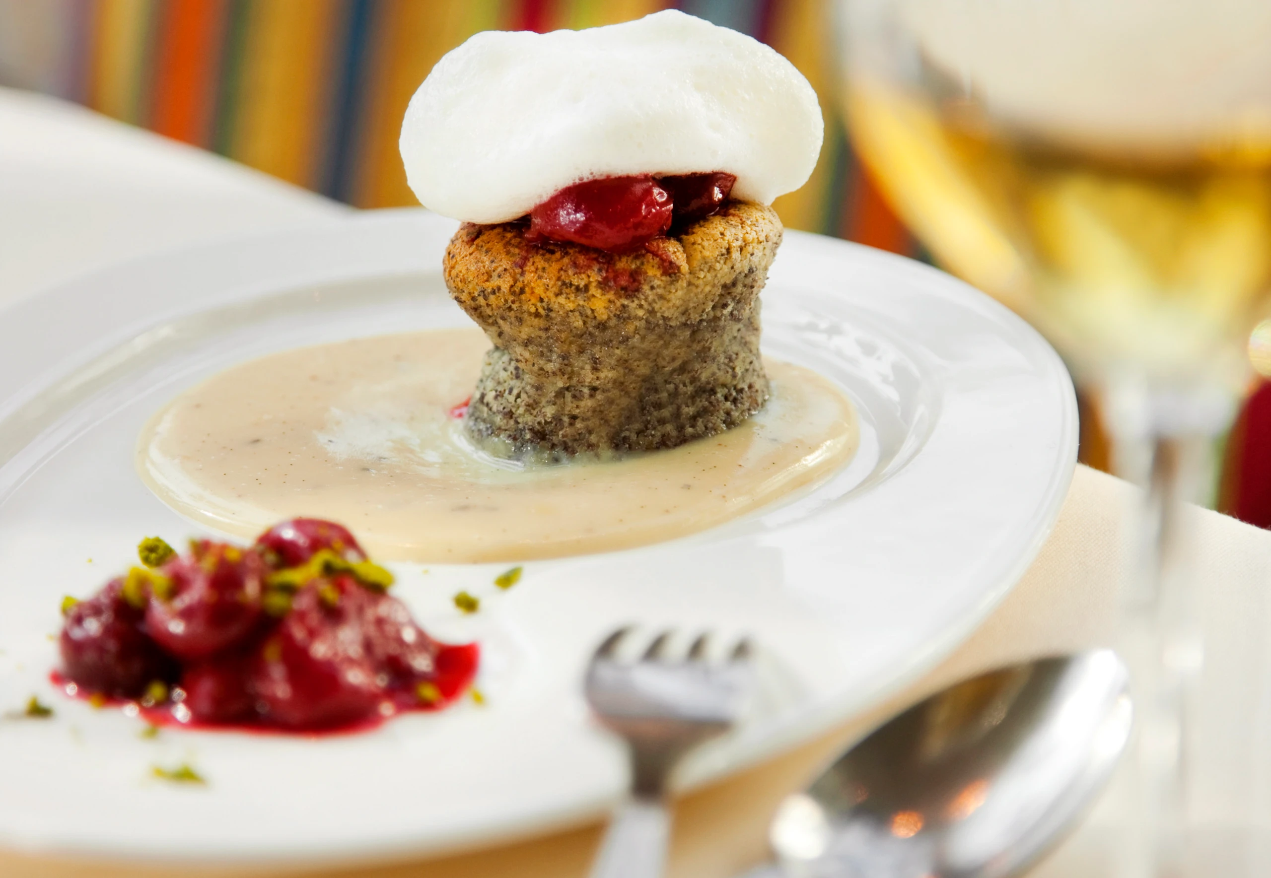 - Für die Garnitur Milch erwärmen und aufschäumen. Puddings aus dem Rohr nehmen, auf Teller stürzen, mit dem Milchschaum garnieren und mit der Mandelsauce anrichten. Dazu passen eingemachte Kirschen.