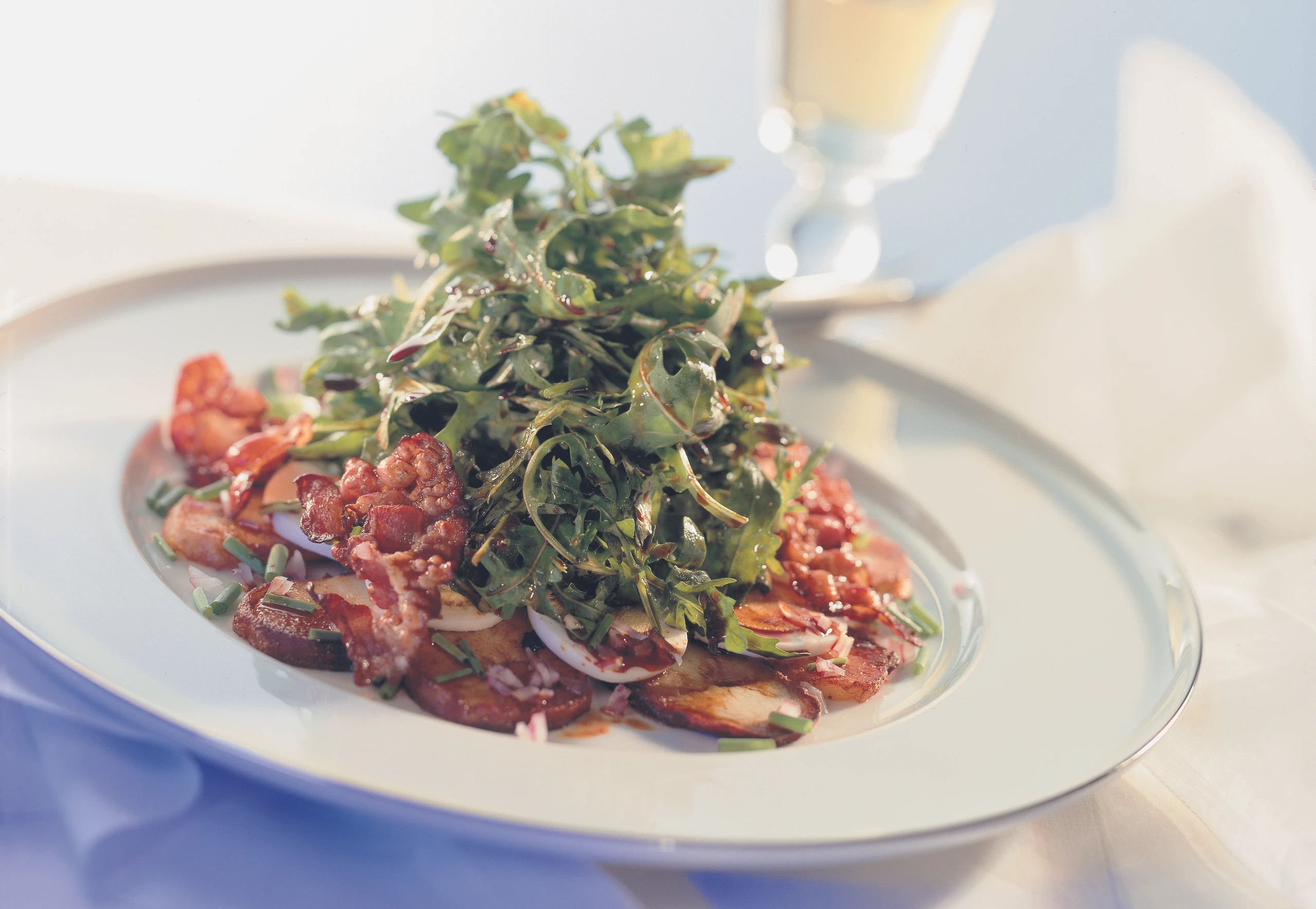 Erdäpfelscheiben und Rucola mit der Marinade vermischen und anrichten: Einige Erdäpfelscheiben kreisförmig auf die Teller legen und mit Eischeiben garnieren. In der Mitte übrigen Salat verteilen, mit Zwiebel und Schnittlauch bestreuen und mit Speckscheiben belegen. Salat mit wenig Kernöl beträufeln.