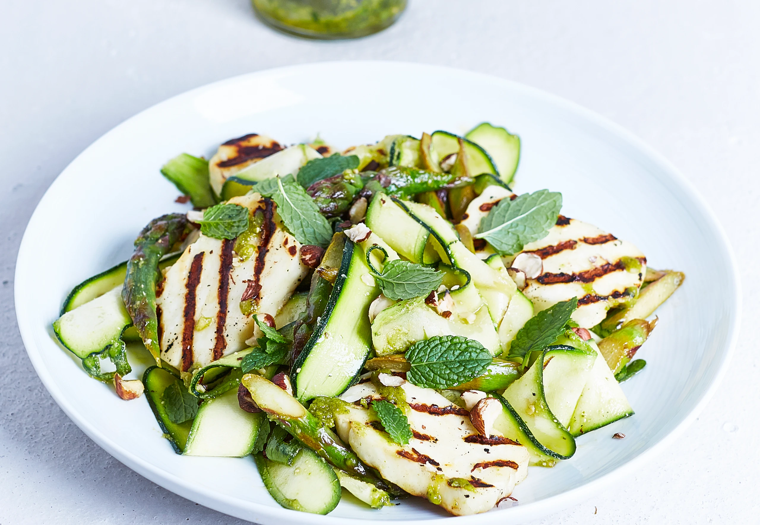 Lauwarmer Spargelsalat mit Halloumi und Pesto-Dressing