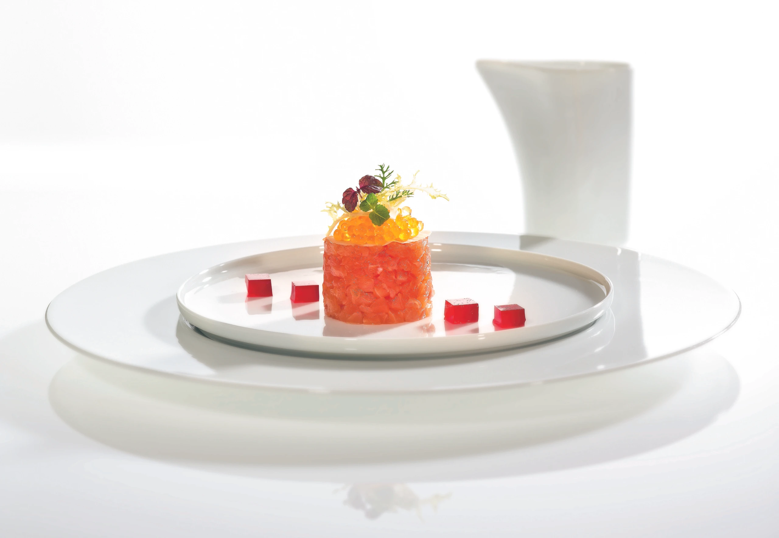 Lauwarmes Tatar von der gebeizten Lachsforelle mit Ingwergelee