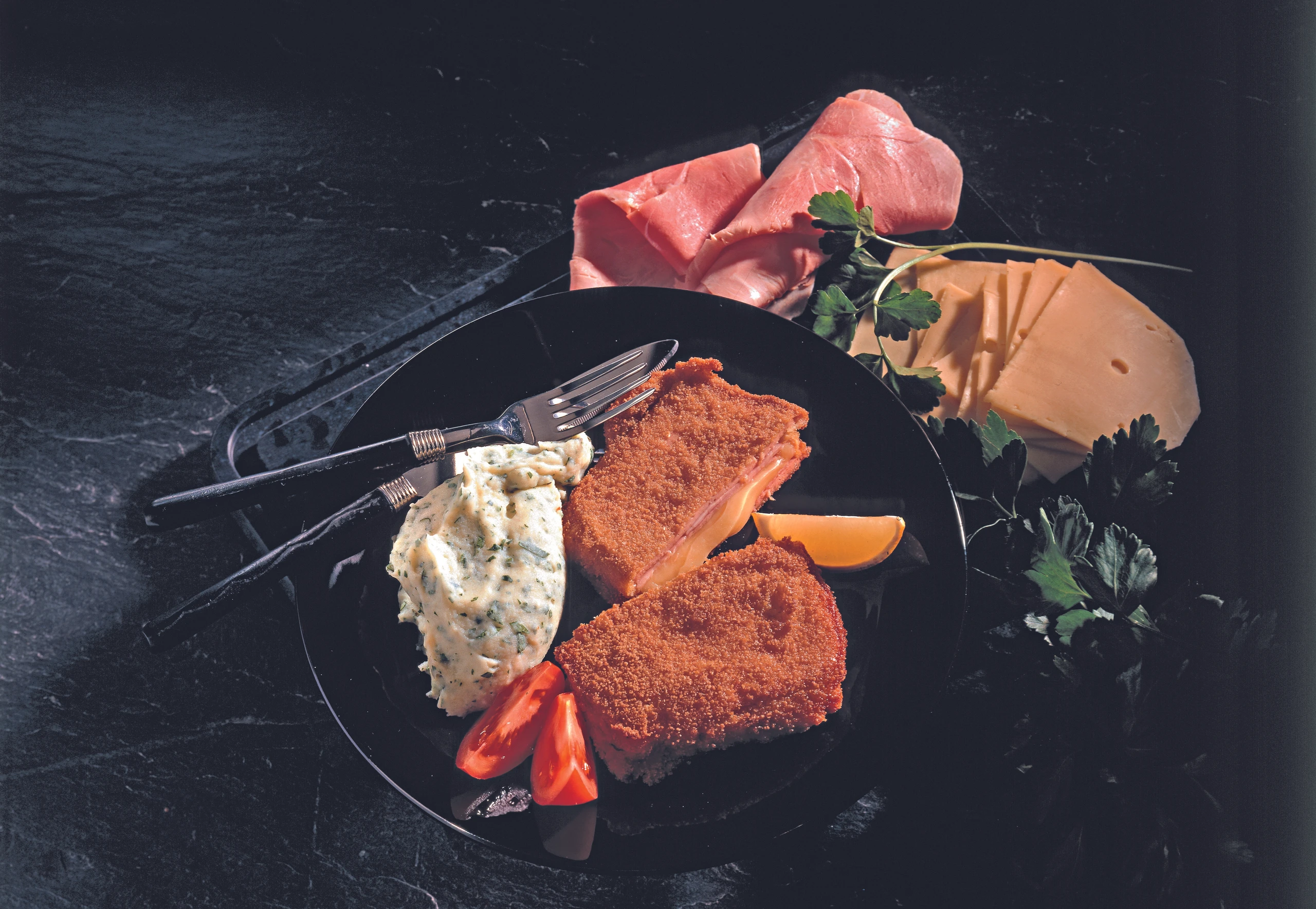 Leberkäs-Cordon-bleu mit Kräuter-Erdäpfelpüree
