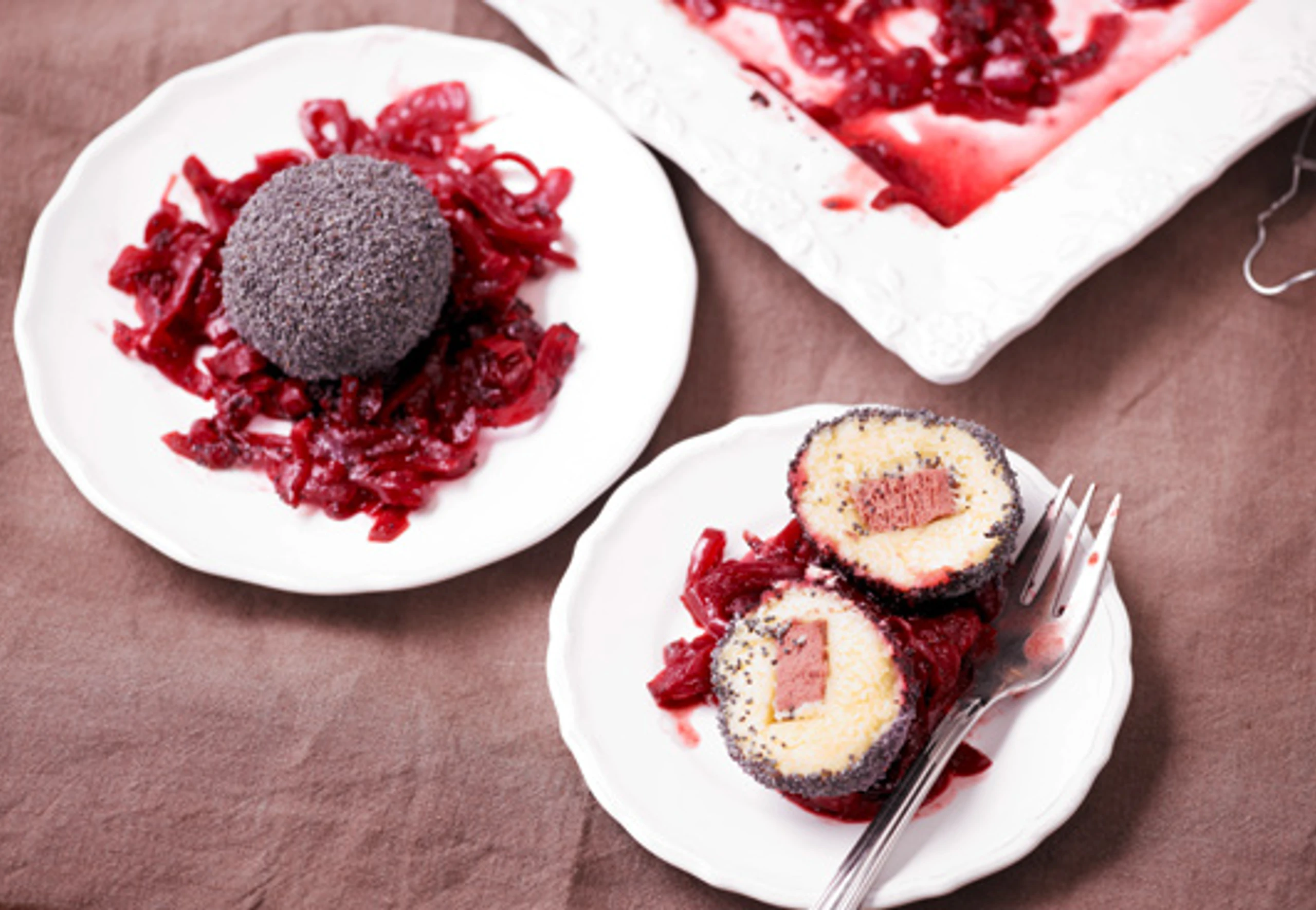 - Knödel mit dem Schaumlöffel aus dem Wasser heben, abtropfen lassen und im Mohn wälzen. Leberknödel auf dem Zwiebelgemüse anrichten.