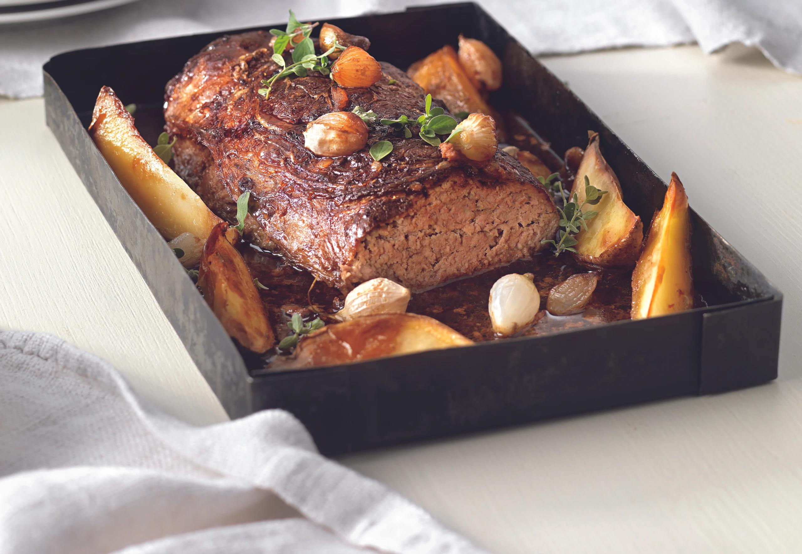 Rohr auf 200°C vorheizen. Schweinsnetz in eine Bratenrein legen, Masse darauf setzten, zu einem flachen Striezel formen, Netz darüber schlagen. Erdäpfel waschen und in Spalten schneiden, Schalotten schälen. Erdäpfel und Schalotten neben den Braten legen, ca. 100 ml Wasser zugießen. Braten im Rohr (untere Schiene / Gitterrost) ca. 1 Stunde braten.