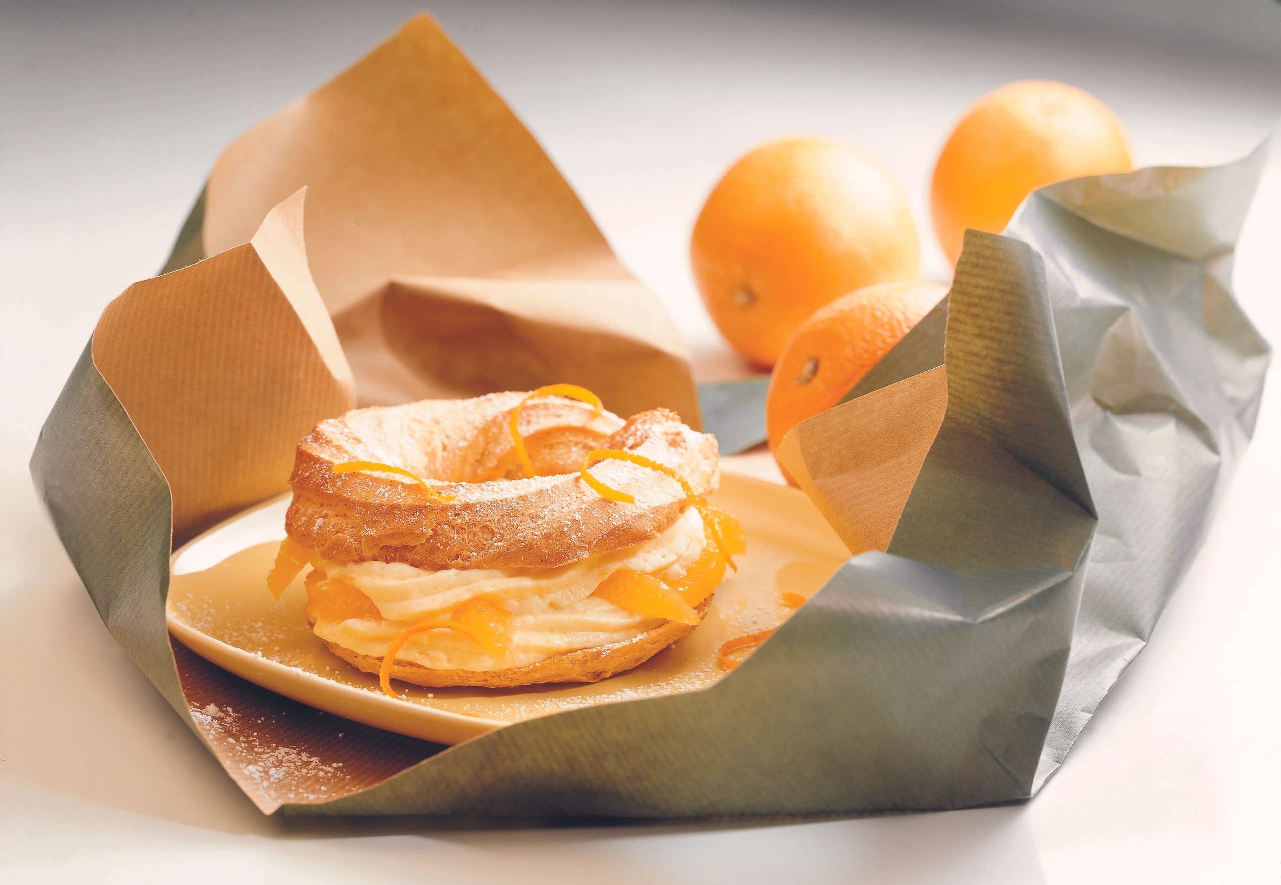Orangen schälen, Filets zwischen den Trennhäuten herausschneiden. Creme in einen Dressiersack mit Sterntülle füllen. Brandteigringe durchschneiden, mit der Creme füllen und mit den Orangenfilets garnieren. Mit Staubzucker bestreuen, eventuell mit Orangenzesten garnieren.