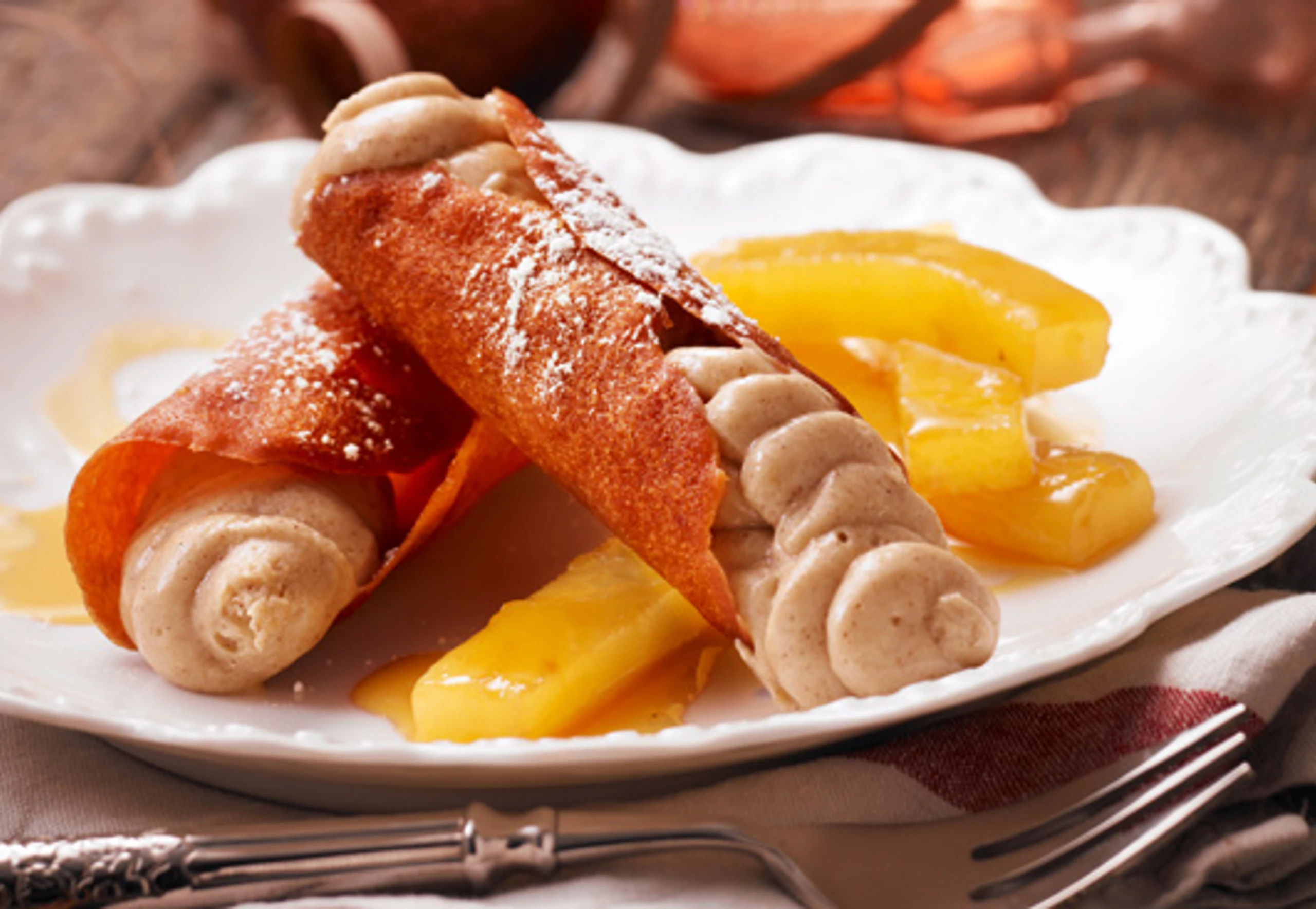 - Rohr auf 180°C vorheizen. Für die Hippen alle Zutaten verrühren, Masse dünn auf Backpapier streichen und 8 Scheiben (Ø ca. 10 cm) ausschneiden. Im Rohr (mittlere Schiene) ca. 8 Minuten backen. Scheiben noch heiß zu Röllchen formen.
