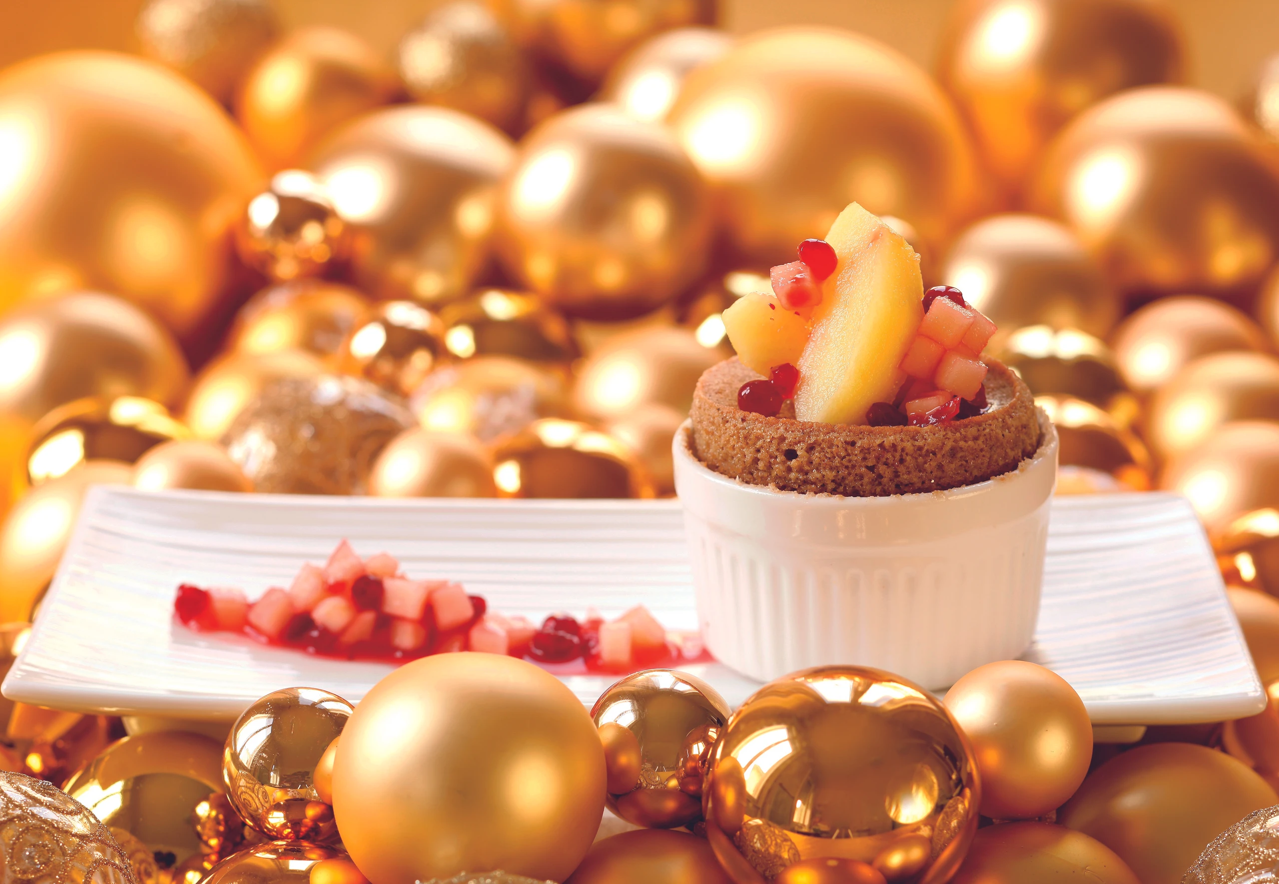 Förmchen auf ein Backblech mit hohem Rand stellen und so viel kochendes Wasser zugießen, dass sie zur Hälfte im Wasserbad stehen. Aufläufe im Rohr (untere Schiene / Gitterrost) 45 Minuten garen. Herausnehmen und mit der Apfelgarnitur servieren.