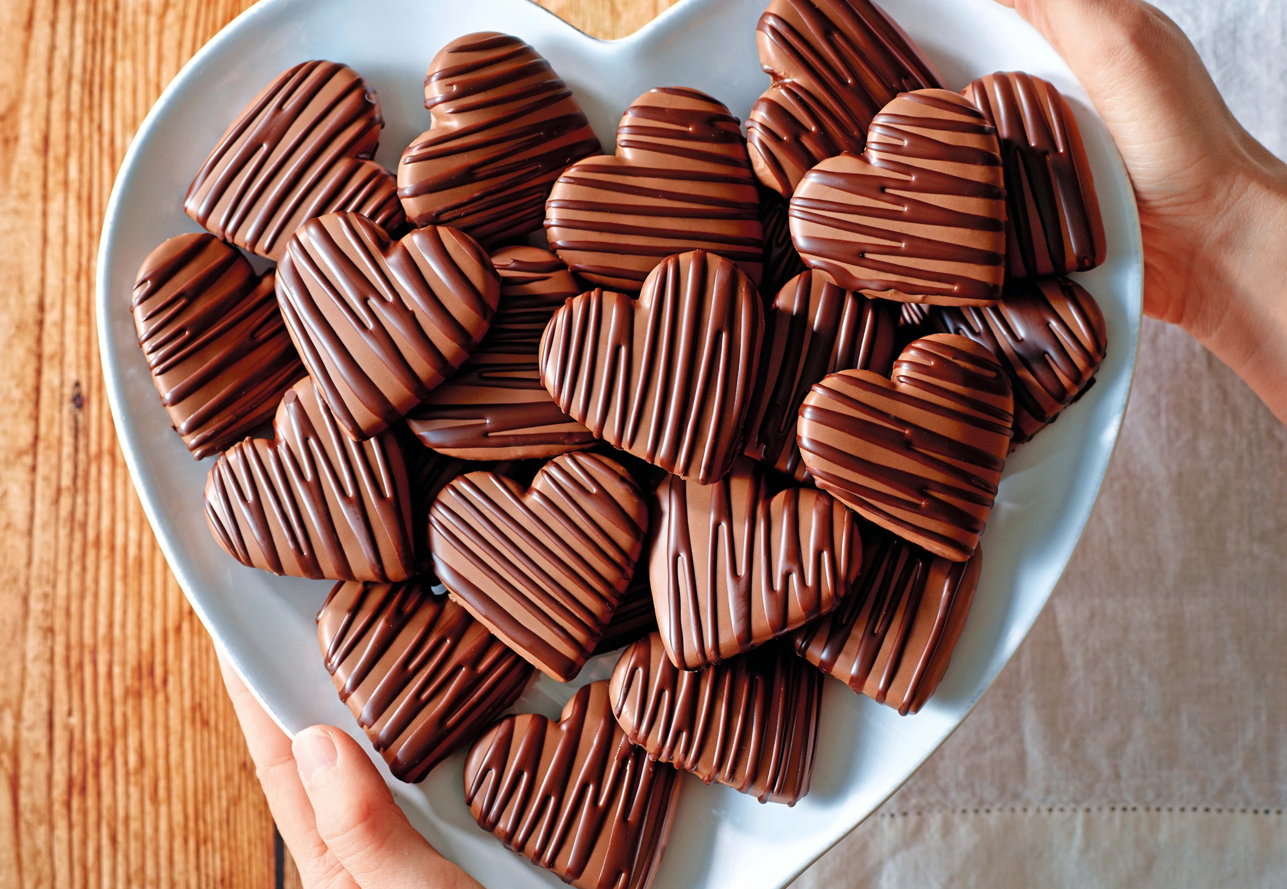 Dunkle Kuvertüre mit restlichem Kokosfett über Wasserdampf schmelzen. Kuvertüre in einen Dressiersack mit glatter Tülle (Ø ca. 2 mm) füllen, Herzen damit verzieren. Auf Backpapier trocknen lassen und in einer Blechdose aufbewahren.