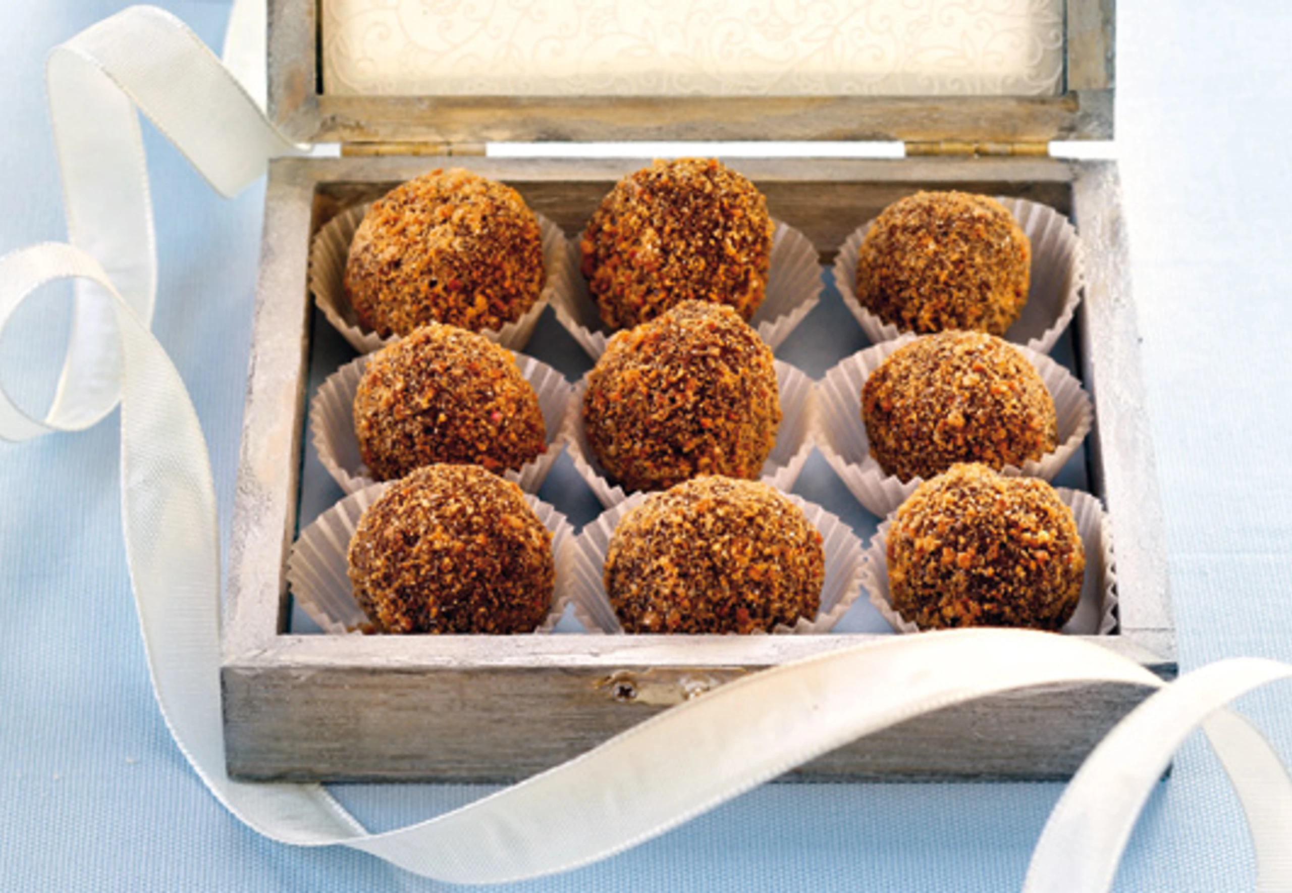 Hände mit Staubzucker stäuben, die Masse zu Kugeln formen. Lebkuchenbrösel und Rohrzucker vermischen, die Kugeln darin wälzen. In Papierkapseln setzen und kühl aufbewahren.