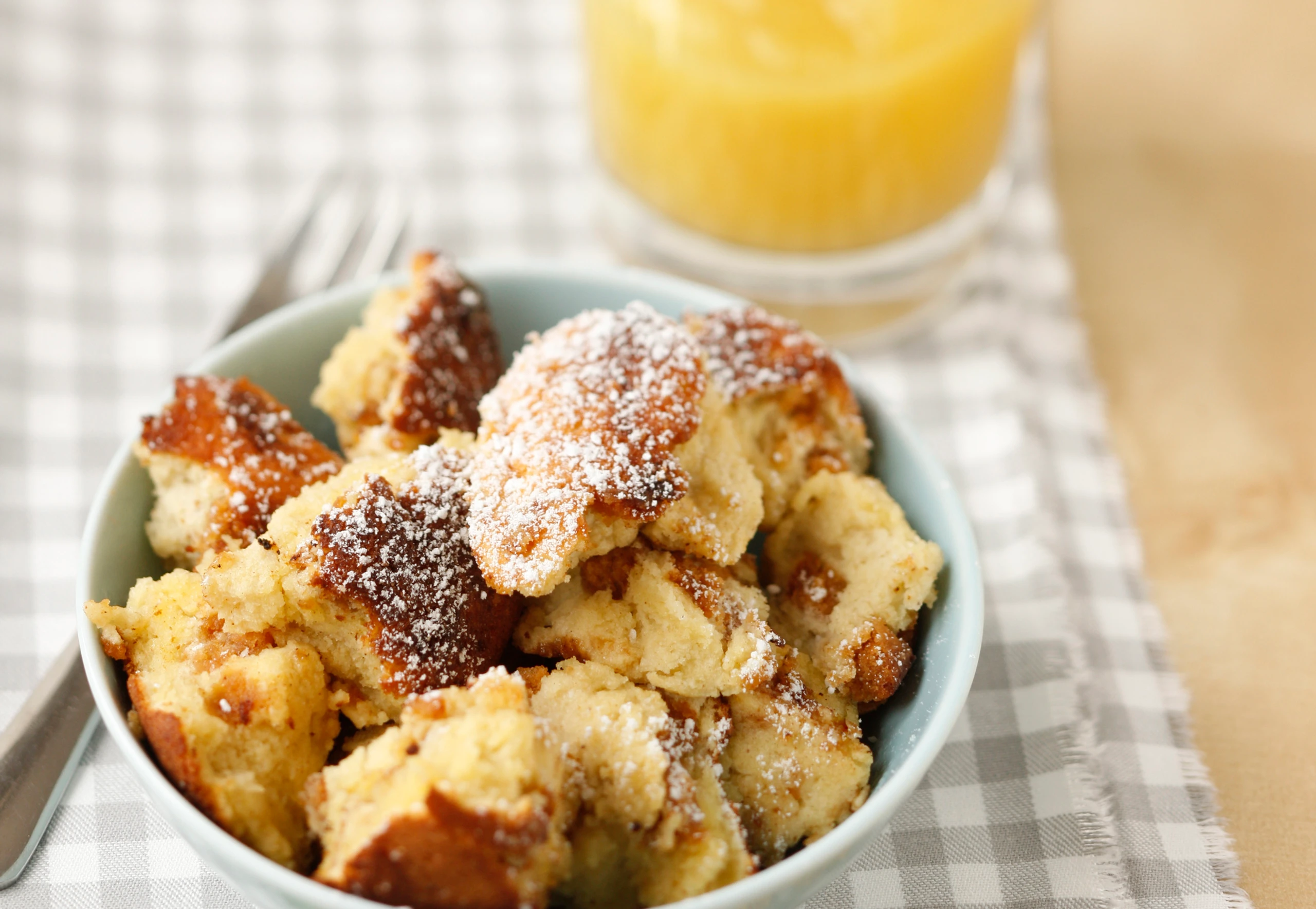 Pfanne aus dem Rohr nehmen, Teig in Stücke teilen, mit Kristallzucker bestreuen und durchmischen. Schmarren anrichten, mit Staubzucker bestreuen und mit dem Apfelmus servieren.