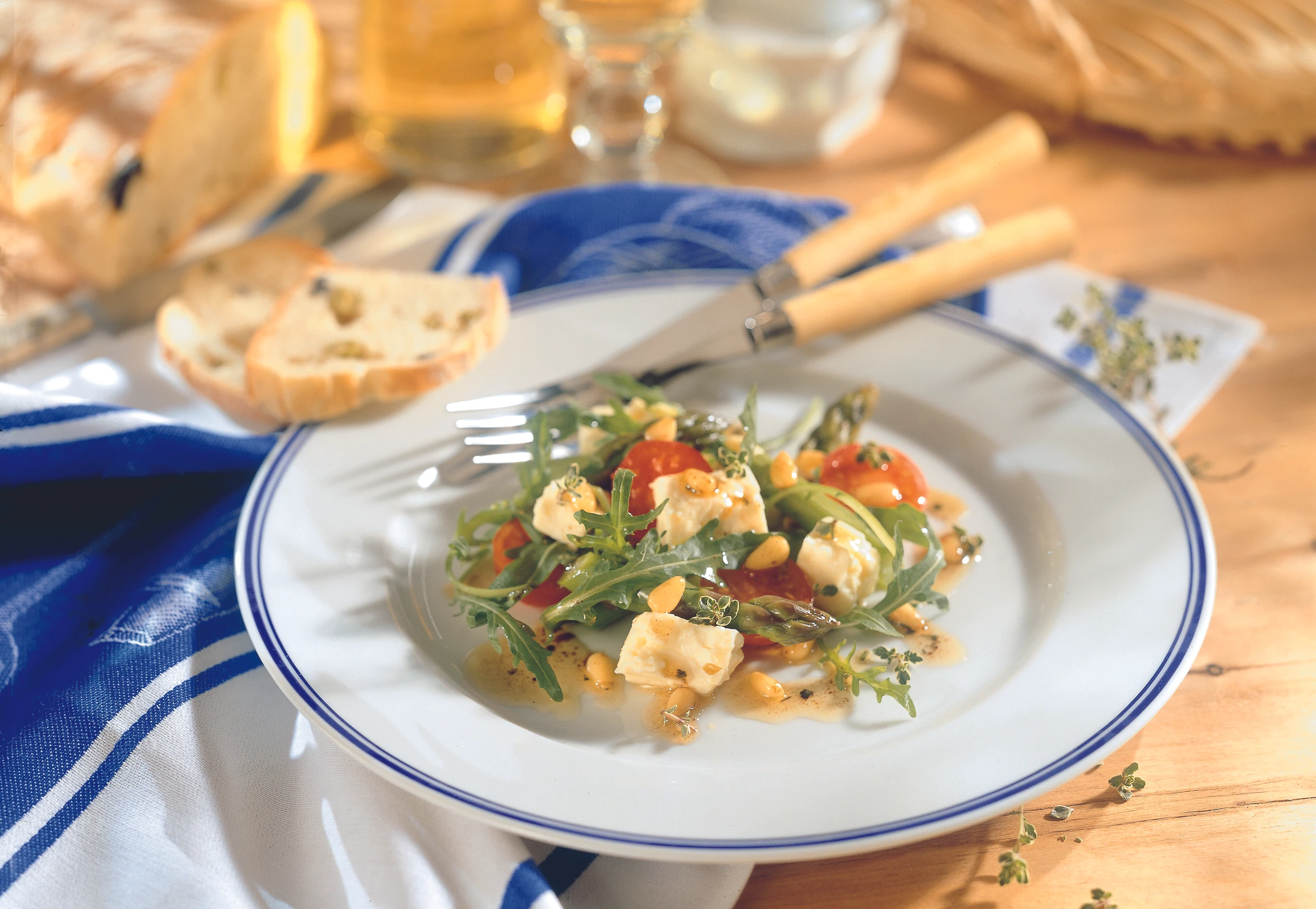 - Tomaten, Spargel, Schafkäse und Rucola behutsam mit der Marinade vermischen. Salat anrichten und am besten mit Olivenbrot servieren.