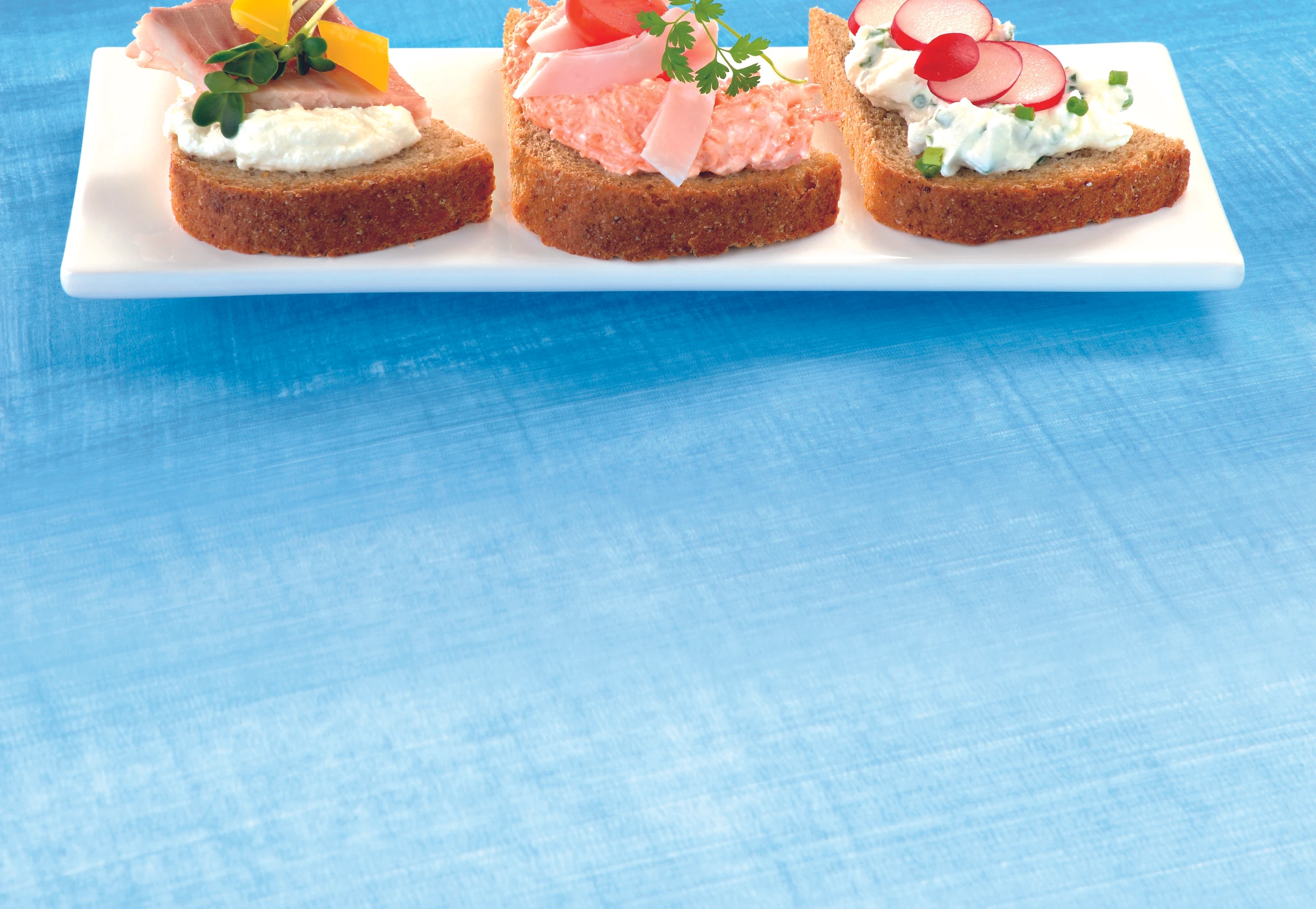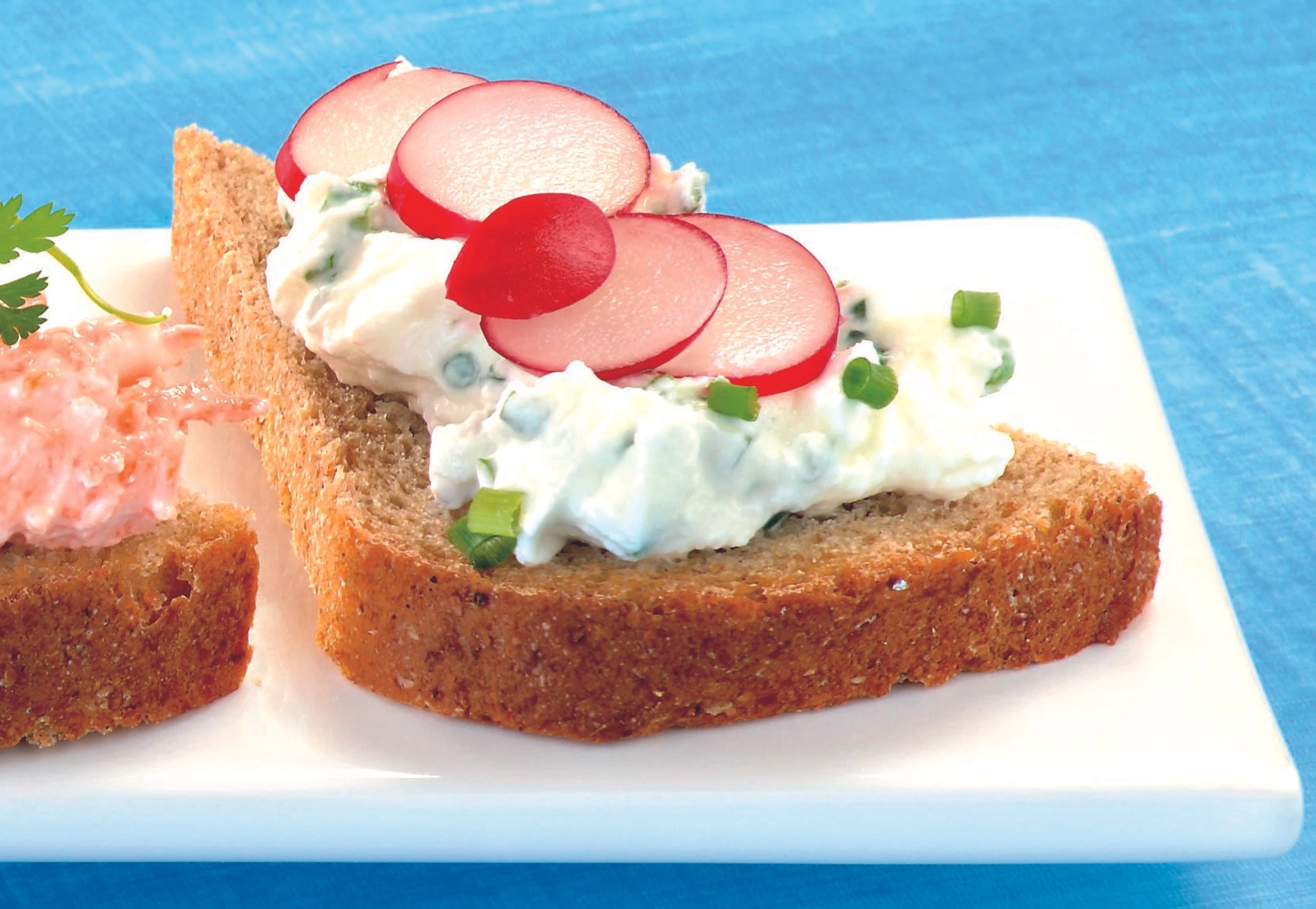 Vollkornbrot damit bestreichen. Brötchen mit Radieschenscheiben belegen.