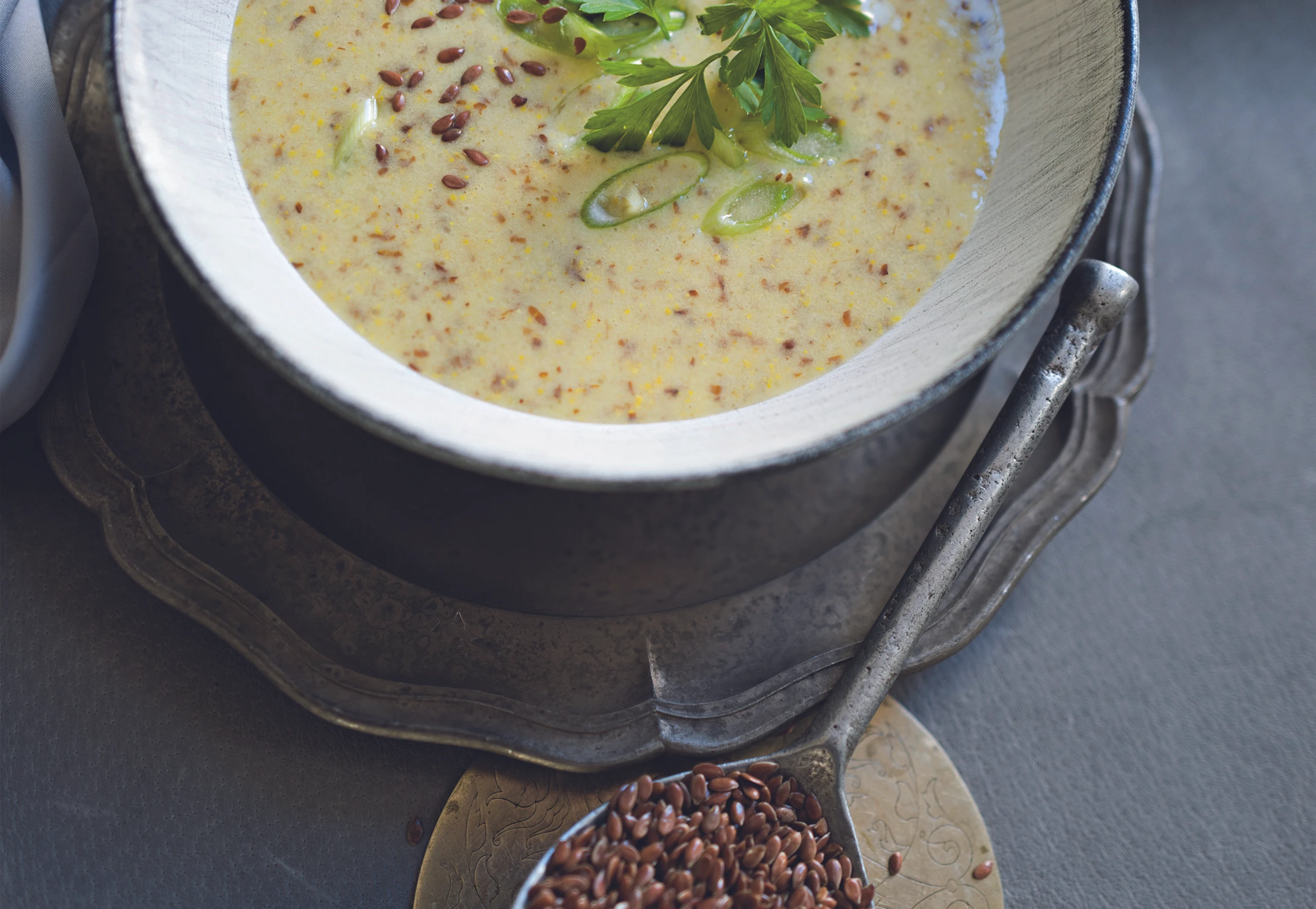- Sauerrahm und die Hälfte vom Leinsamen einrühren. Suppe mit dem Stabmixer fein pürieren, mit Salz, Pfeffer, Muskat und Kümmel abschmecken, mit Jungzwiebeln, Petersilie und übrigem Leinsamen bestreut servieren.